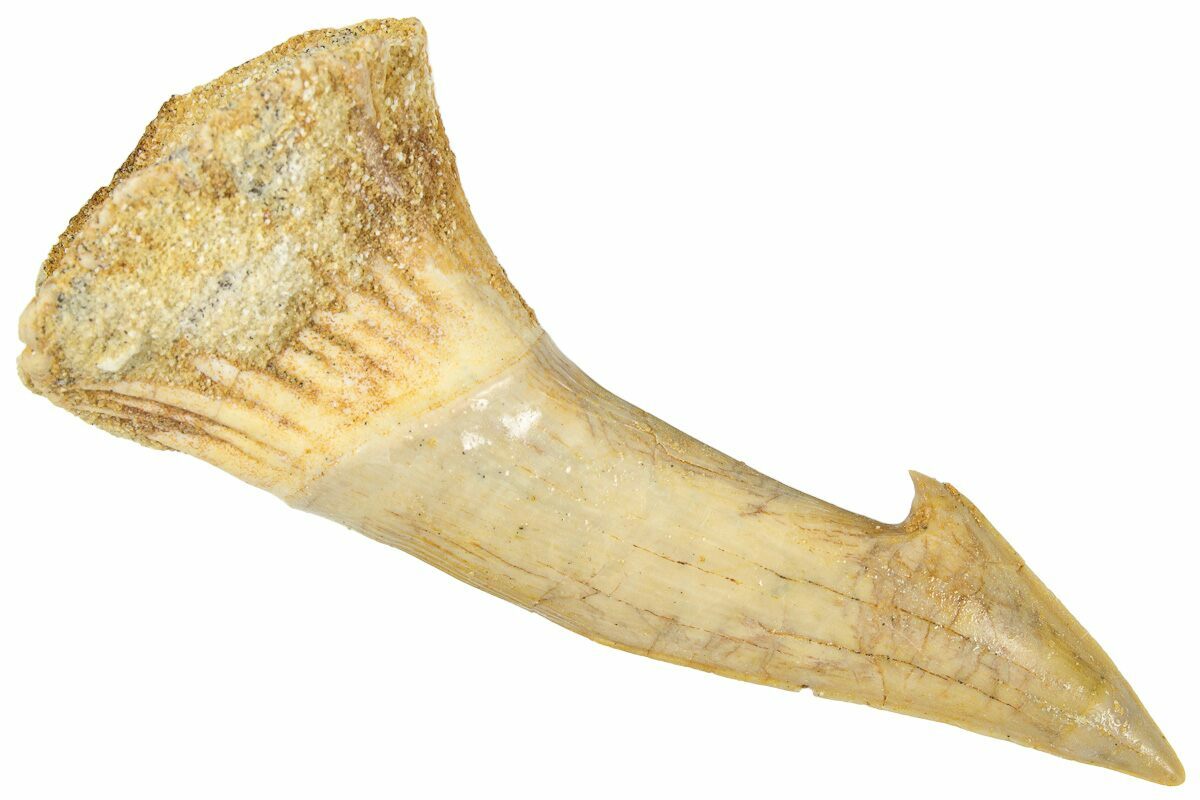This is a nice, 2.85" long rostral barb/tooth from an extinct, giant sawfish (Onchopristis numidus). It was collected from the Kem Kem Beds in Taouz, Morocco.