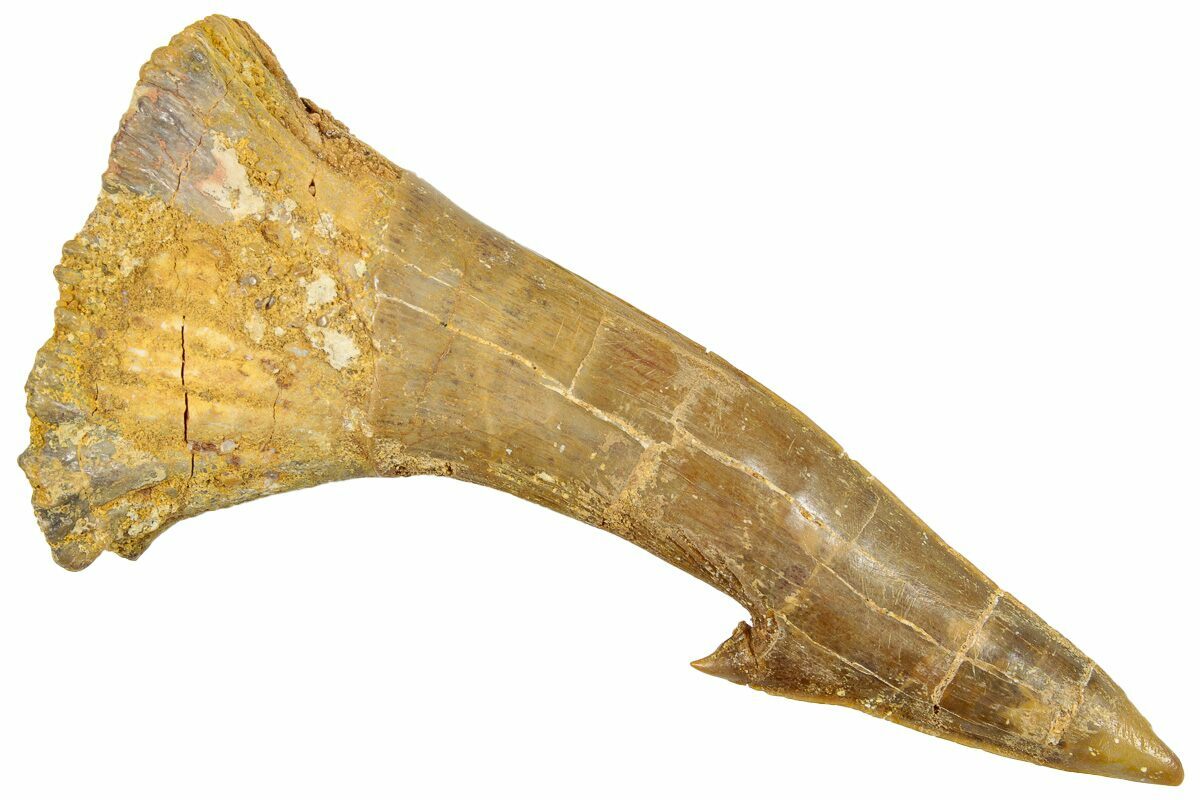 This is a 2.85" long rostral barb/tooth from an extinct, giant sawfish (Onchopristis numidus). It was collected from the Kem Kem Beds in Taouz, Morocco. There are multiple repaired cracks through the specimen.