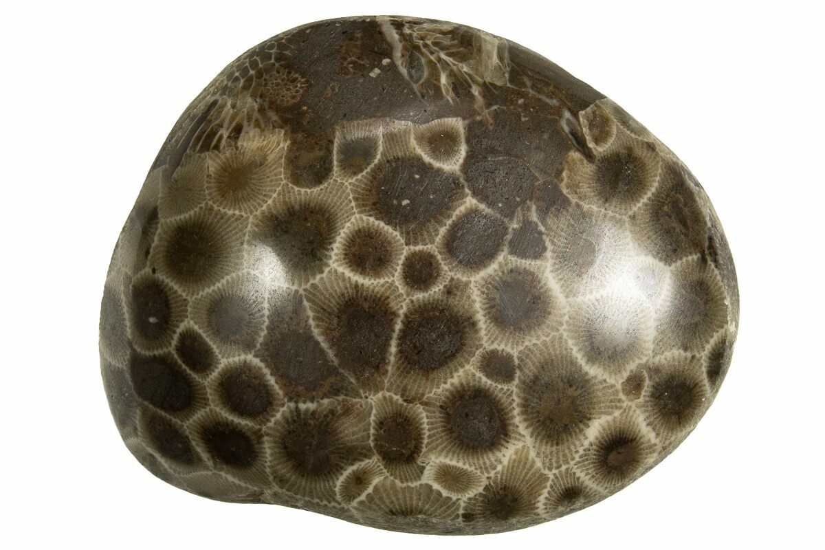Known locally as Petoskey stones, this fossil coral is commonly found along the shores of Lake Michigan and Lake Huron, as well as in rock quarries stretching from Alpena to Traverse City, Michigan. The material comes from Hexagonaria percarinata, a species of rugose coral that lived during the Middle Devonian, roughly 350 million years ago. Petoskey stones are officially designated as the state stone of Michigan.