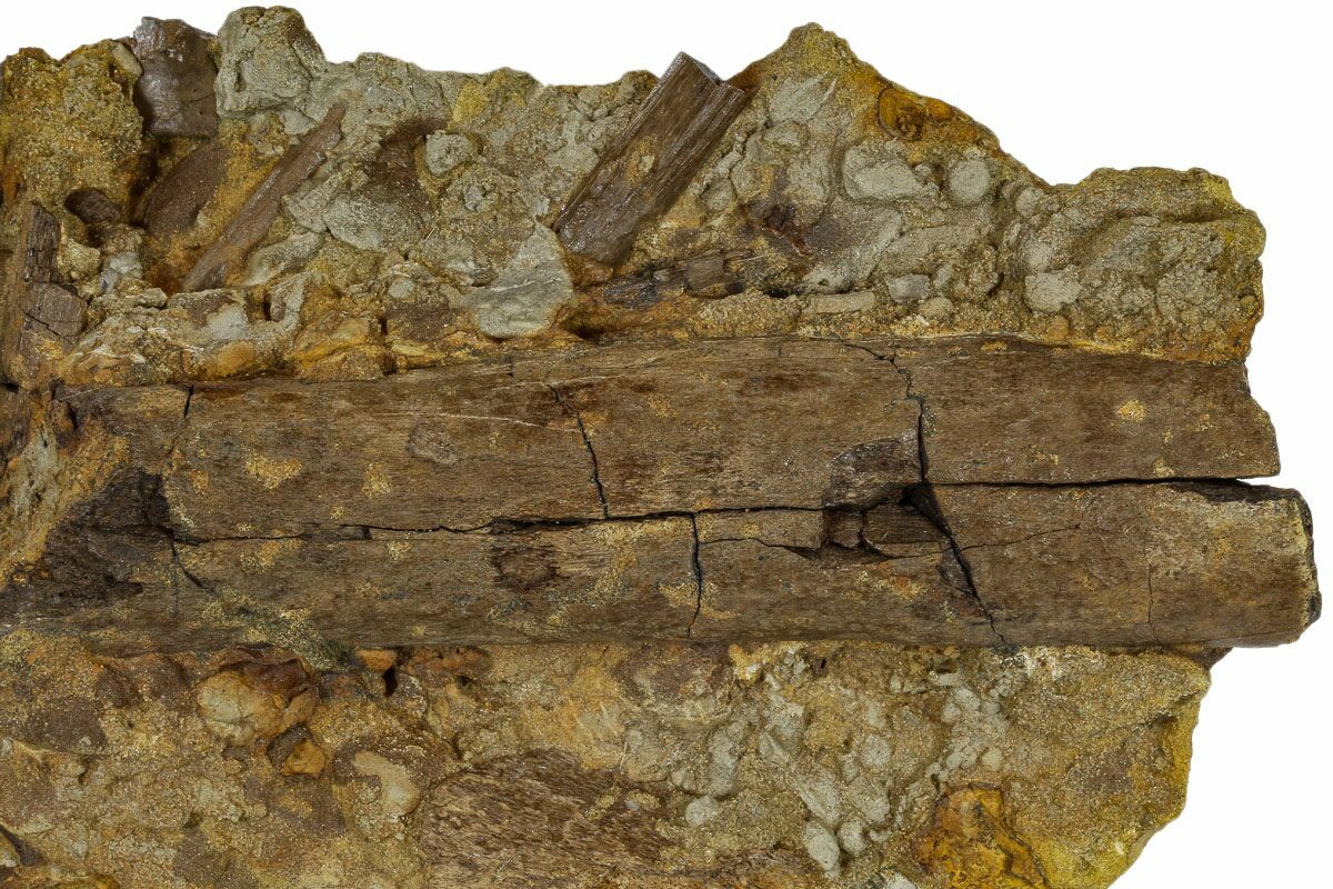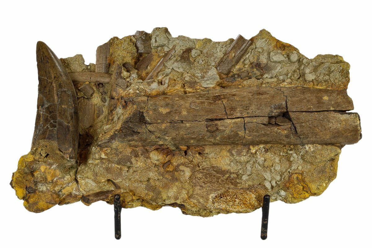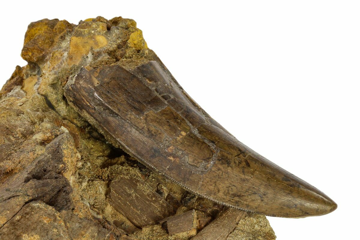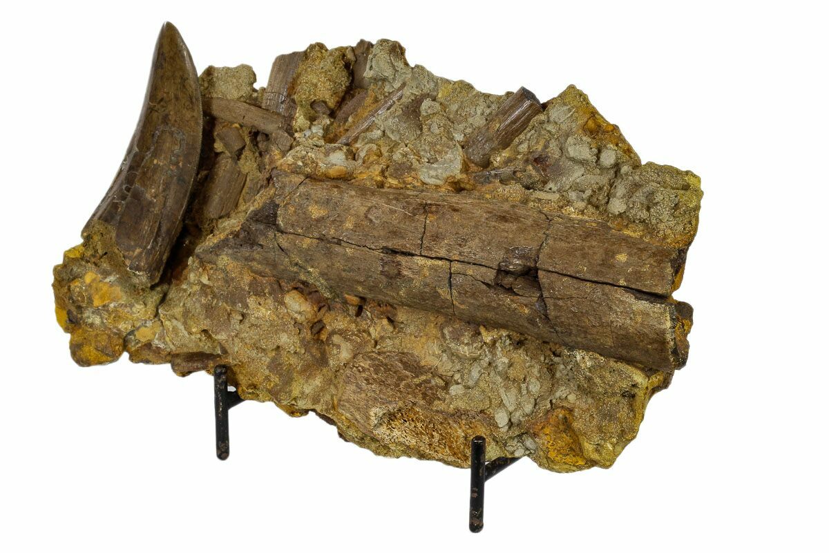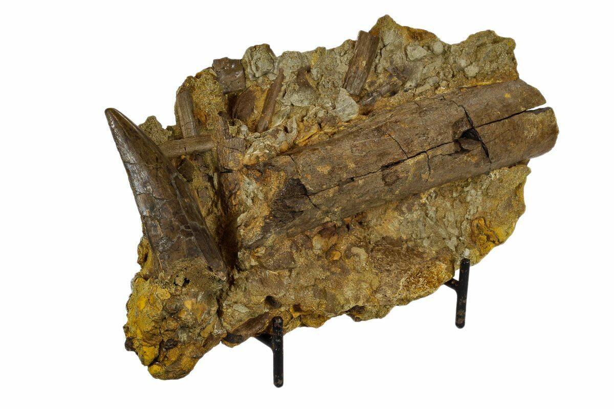 The tooth itself is beautiful and 2.89" in length. The serrations are present on mesial and distal edges with only a few missing areas. It's located in it's original matrix which is full of a wide variety of bone fragments, including an unidentified partial radius (arm bone) and crocodile scute.