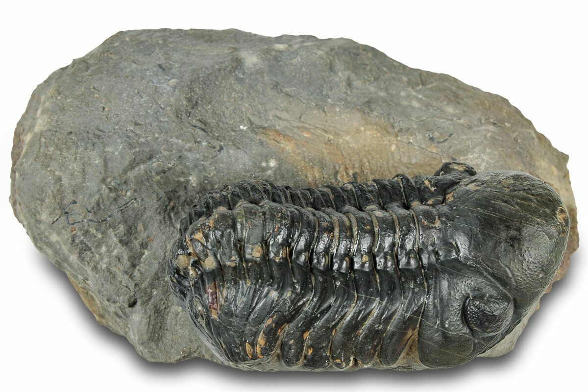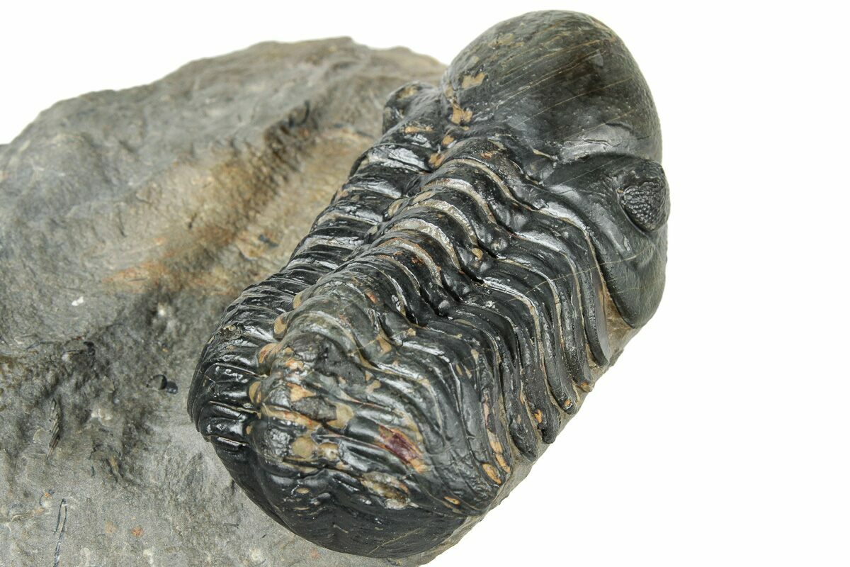 This is a 2.9" long, detailed Reedops trilobite collected near Atchana, Morocco. It has a lot of surface detail including visible preserved eye facets in its eyes. It has been prepared to remove the surrounding limestone so that it looks like it's ready to crawl off the rock.