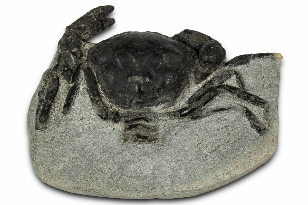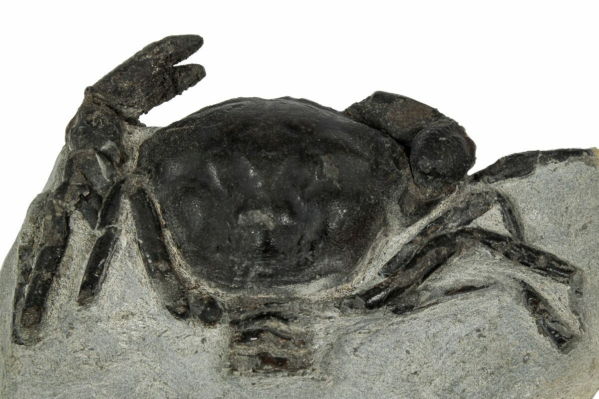 This is a wonderfully prepared example of the Late Eocene aged fossil crab Pulalius vulgaris. These crabs are found within hard concretions (a mass of rock that forms around organic manner) that erode out of the Lincoln Creek Formation, which must be broken open to find the crab. The crab must then be prepared from the hard concretion using mechanical tools, a very time consuming process.