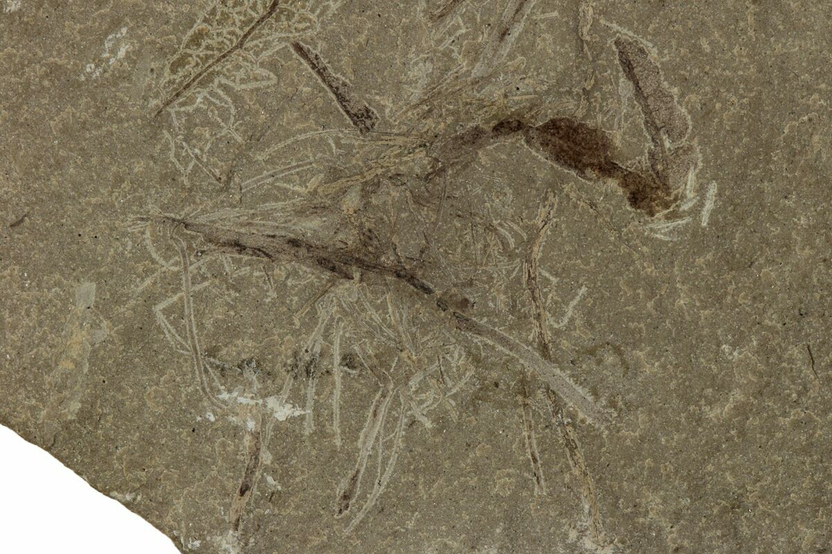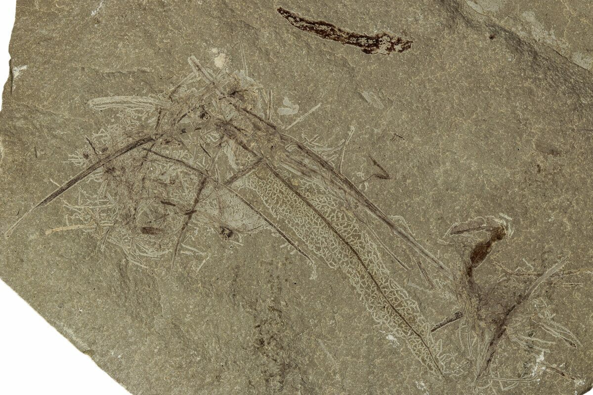 This is a detailed, .25" long fossil ant (family Formicidae) preserved alongside a faint leaf, collected from the Green River Formation of Utah. While this formation is best known for well preserved fossil fish found in Wyoming, other sections of the formation contain a very diverse flora variety and insect fauna.