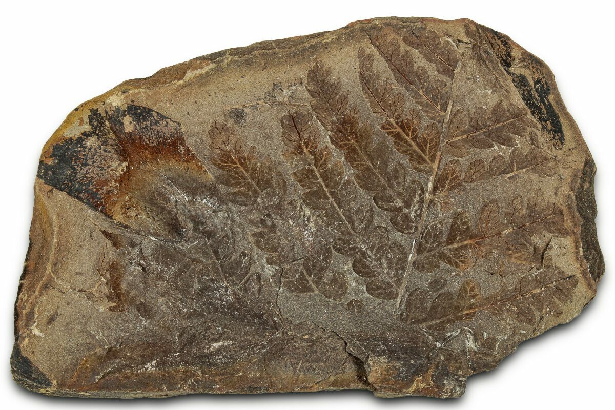 This is a 2.9" fern fossil (Mariopteris sp.) from the Carbondale Formation (Francis Creek Shale) in Braidwood, Illinois. It is preserved inside an ironstone nodule associated with the famous Mazon Creek Lagerstätte. Under magnification the detail of this specimen stands out. Both the positive (convex) and negative (concave) sides of the fossil nodule are included.