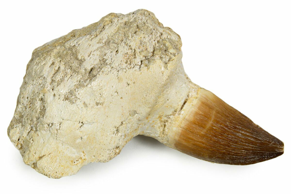This is a jaw section with a complete rooted tooth from a mosasaur (Halisaurus arambourgi?). This specimen was collected from the Upper Cretaceous phosphate deposits in the Oulad Abdoun Basin of Morocco.