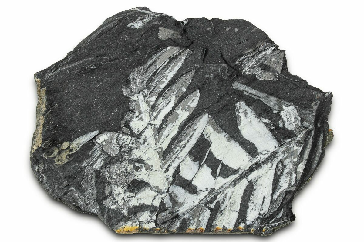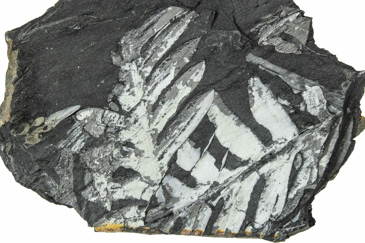 These plants were buried in a swamp where a low temperature, low pressure, and low oxygen environment caused the plant tissue to be slowly replaced by pyrite. This pyrite was later replaced by a whitish mineral (aluminum silicate) as the fossils were buried and exposed to the heat and pressure inside of the earth. The majority of the ferns on this plate are of the genus Alethopteris, though Pecopteris ferns can be seen from time to time.