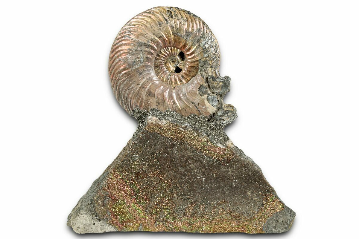 This is an interesting and colorful pyritized ammonite (Quenstedticeras sp.) display. The ammonite was collected from the Middle Jurassic age deposits along the banks of the Volga River near Saratov, Russia. It has been mounted to this section of iridescent pyrite ("rainbow pyrite") encrusted rock to create this alluring display.