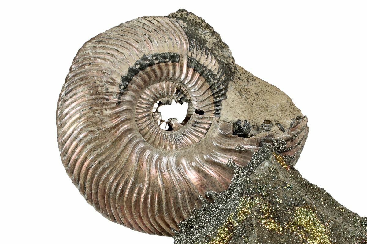 This is an interesting and colorful pyritized ammonite (Quenstedticeras sp.) display. The ammonite was collected from the Middle Jurassic age deposits along the banks of the Volga River near Saratov, Russia. It has been mounted to this section of iridescent pyrite ("rainbow pyrite") encrusted rock to create this alluring display.