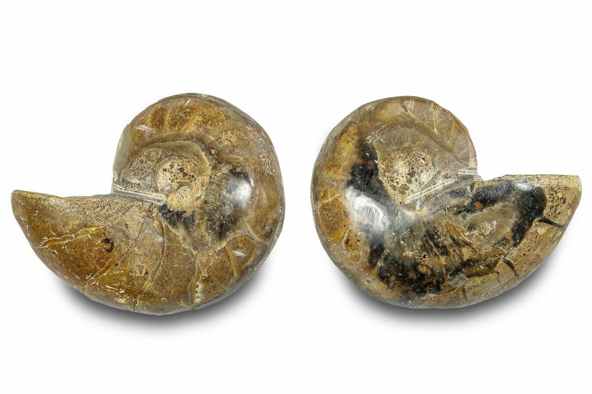 The nautilus is cut in half and polished, revealing the inner chamber structure of this ancient marine animal. Its exterior has also been polished. Both halves are included and each comes with a display stand.