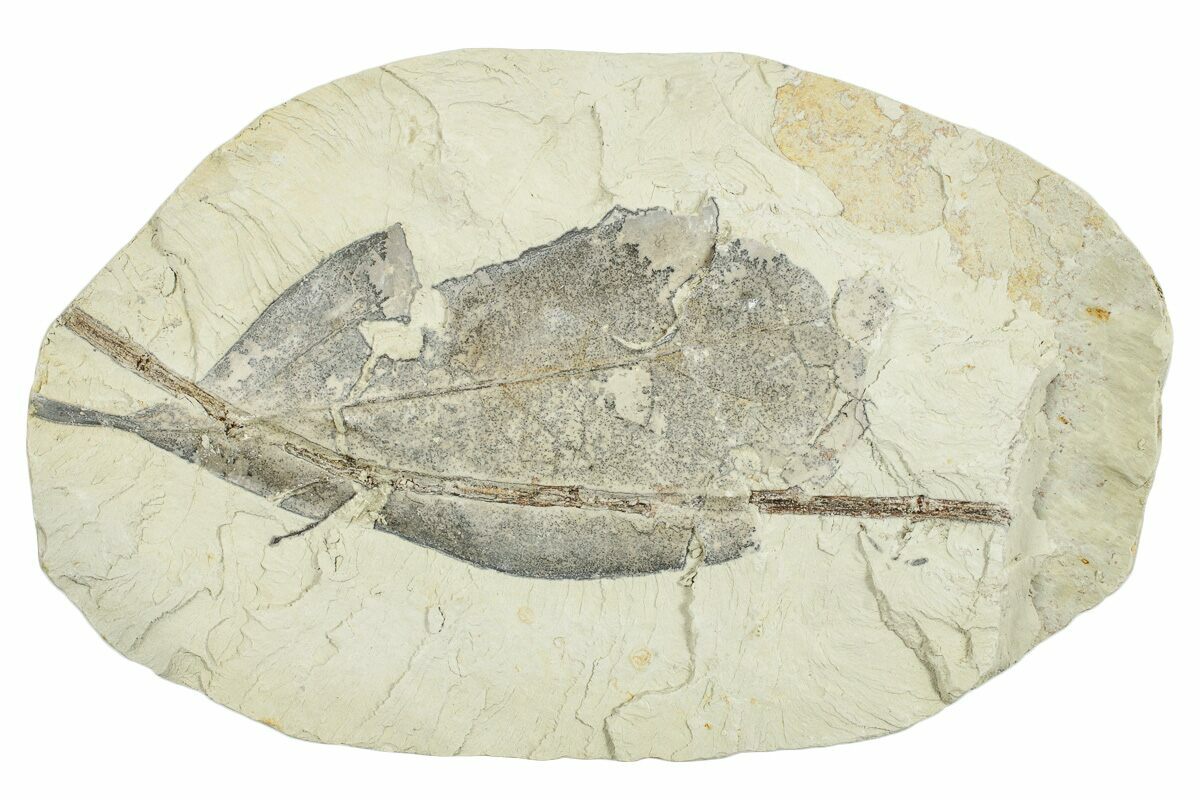 This is a 2.9" long fossil leaf (Daphnogene (Cinnamomum) polymorpha) with stem impression, collected from Miocene-aged deposits near Augsburg, Germany. This is part of an older collection our team recently acquired.