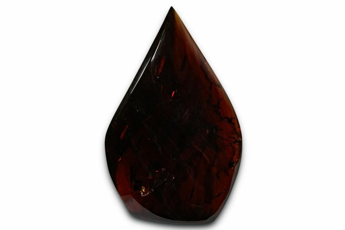 This is a 2.9" tall piece of "blue" amber collected from coal deposits near West Kalimantan, Indonesia. It has been shaped in the a "flame" sculpture and the base is cut flat so that it stands up nicely on a flat surface.