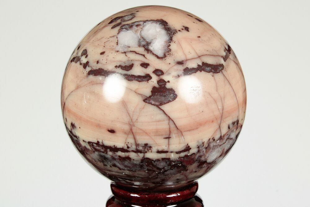 This is a gorgeous, 2.9" wide jasper sphere of Kona dolomite that was collected from the Kona Hills of Michigan. The sphere has a mixture of creamy dolomite hues and deep-red and maroon coloration.