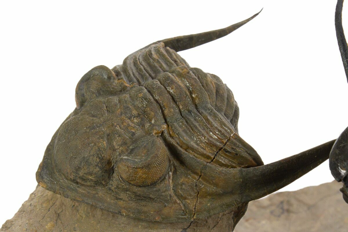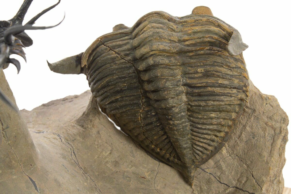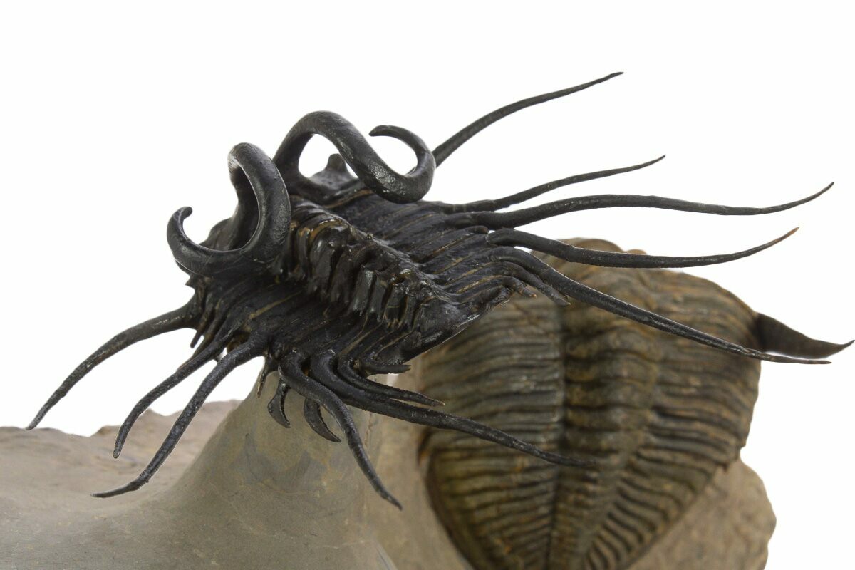 This is a spectacularly prepared example of Dicranurus monstrosus naturally associated with a Zlichovaspis rugosa trilobite. The Dicranurus measures 2.9" wide, has about 1% restoration, and has been prepared so it appears to fly above the rock on a pillar of limestone. The Zlichovaspis would be about 3" long it outstretched and has about 2-3% shell restoration in spots across its segments and along repaired cracks. A really amazing piece.