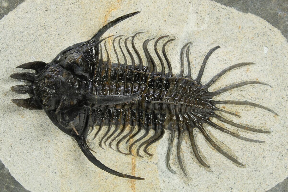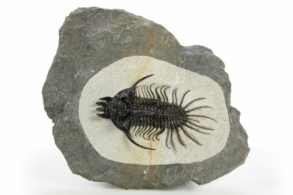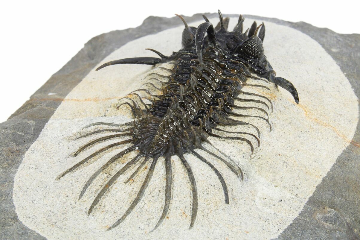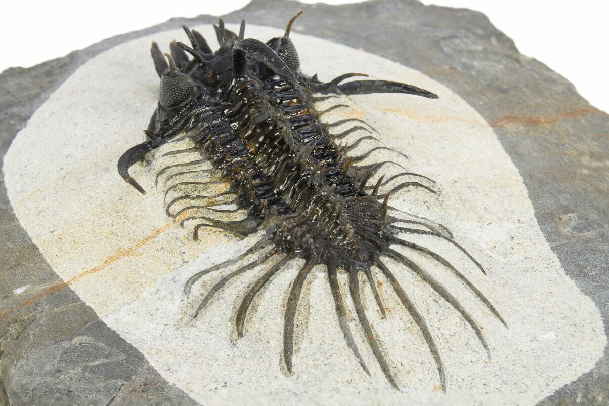 This is a spectacular specimen of one of our favorite species of trilobites, the very alien-looking Quadrops flexuosa. This bizarre trilobite has a distinctive four-forked protrusion coming off of the front of its head which is where the genus gets its name. It is not only a rare trilobite but extremely difficult and time-consuming to prepare owing to the hardness of the rock and it's many free standing spines.