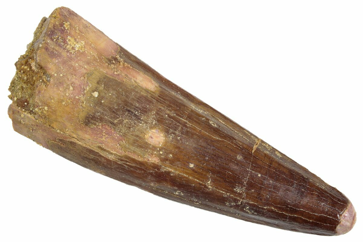 This is a 2.90" long Spinosaurus tooth from the Kem Kem Beds of Morocco. It is Late Cretaceous in age, approximately 95 million years old.