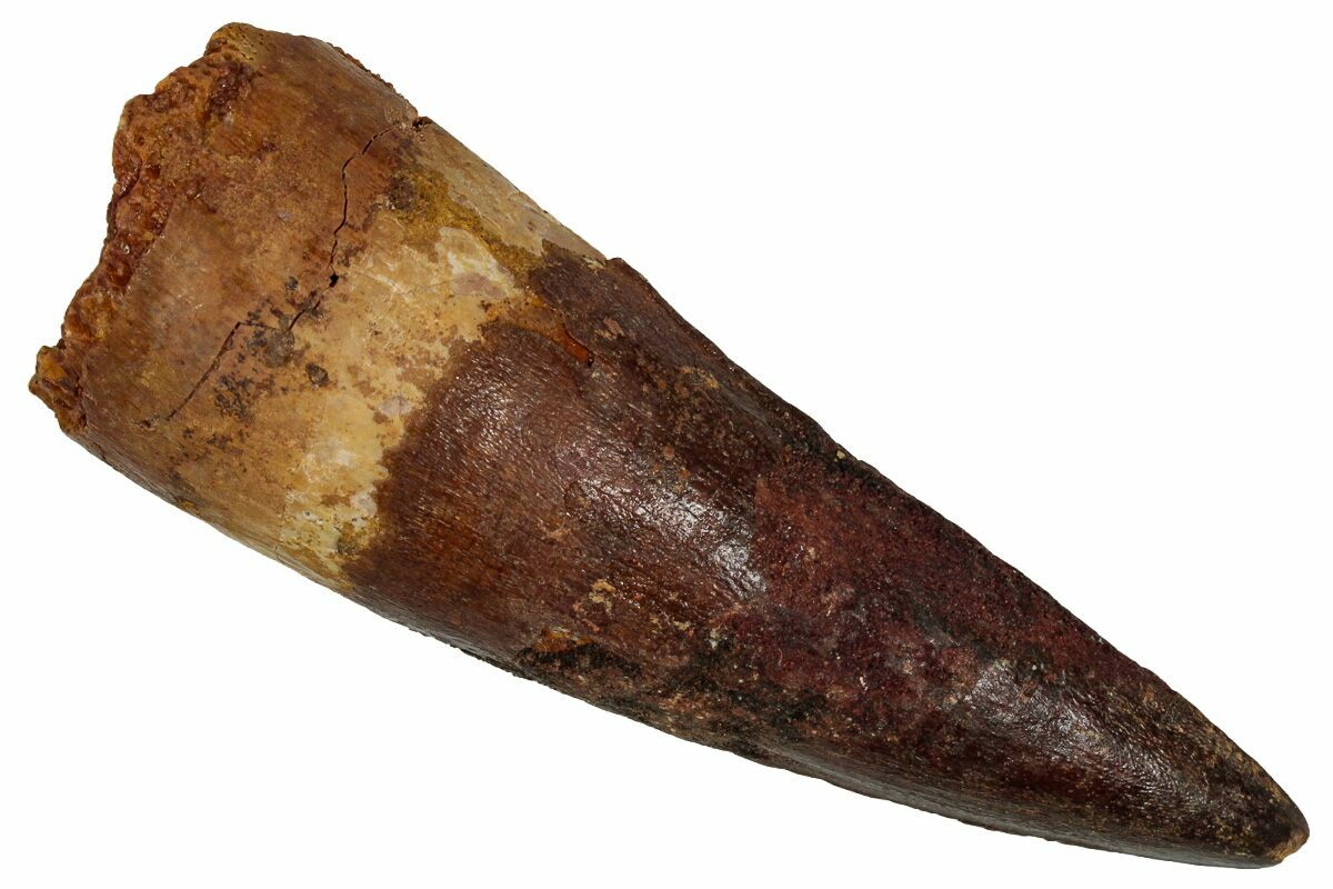 Spinosaurus teeth are relatively common fossils, but large (3+ inches), well-preserved examples are rare. These large Spinosaurus teeth will often be heavily doctored. We’ve seen many examples where multiple partial teeth can been glued to together to create a larger fake tooth, or where enamel has been painted on. One giveaway to look for is a ring of sand around the middle of the tooth, usually glued on to hide a break. Sometimes this is a sign that multiple partial teeth have been composited, but other times it is used to disguise a badly done repair job.
