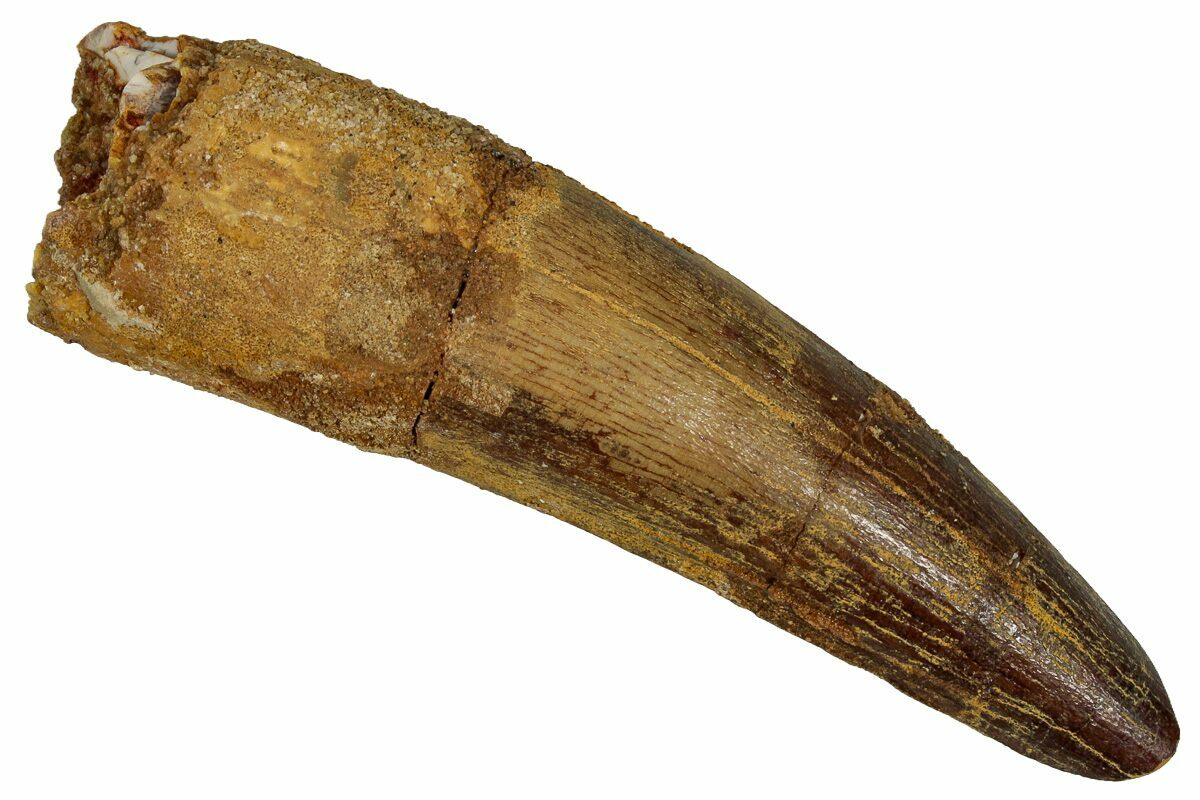 This is a 2.90" long Spinosaurus tooth from the Kem Kem Beds of Morocco. It is Late Cretaceous in age, approximately 95 million years old.