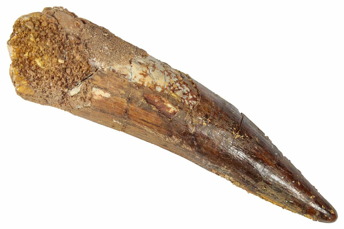 This is a 2.93" long Spinosaurus tooth from the Kem Kem Beds of Morocco. It is Late Cretaceous in age, approximately 95 million years old.