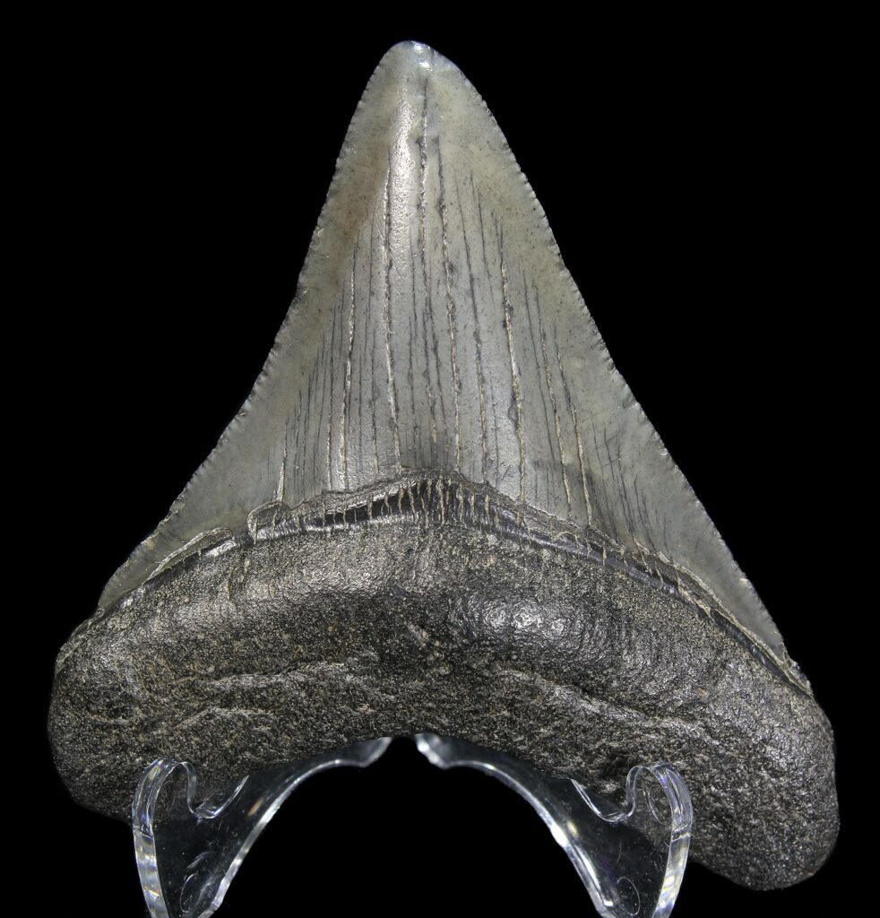The standard measure for megalodon teeth is slant height, or the longest edge of the tooth. Adult megalodon teeth were typically in the 4 to 5 inch range: teeth over 6 inches are rare and represent super-sized individuals. Only a handful of teeth have ever been found over seven inches.