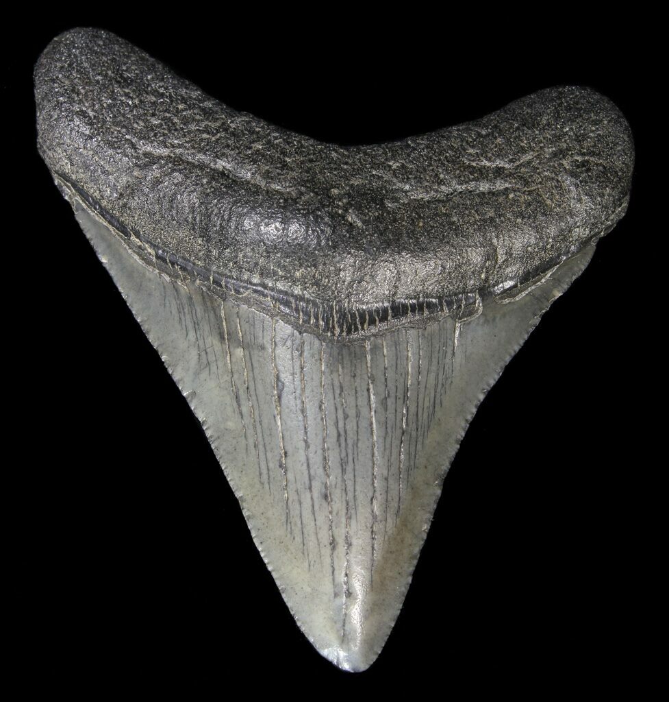 Their teeth were bone-crunching and flesh-cutting tools evolved for grasping powerful prey such as baleen whales. Fossil evidence supports that megalodon focused its attack on the hard, bony parts of its prey, such as rib cages, flippers, shoulders, and spines, effectively disabling large whales and harming major organs such as the heart and lungs. This strategy explains their thick, robust teeth.