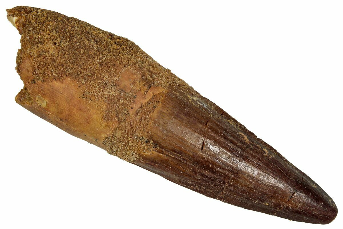 Spinosaurus teeth are relatively common fossils, but large (3+ inches), well-preserved examples are rare. These large Spinosaurus teeth will often be heavily doctored. We’ve seen many examples where multiple partial teeth can been glued to together to create a larger fake tooth, or where enamel has been painted on. One giveaway to look for is a ring of sand around the middle of the tooth, usually glued on to hide a break. Sometimes this is a sign that multiple partial teeth have been composited, but other times it is used to disguise a badly done repair job.