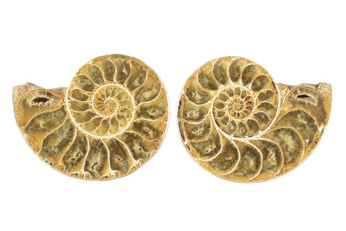 The previously hollow chambers of the ammonite were replaced with a beautiful agate during the fossilization process. Some of these chambers are still partially hollow and lined with druzy crystals. The ammonite was cut in half and polished revealing the inner chamber structure of this ancient marine animal. Both halves are included and they come with a pair of display stands.