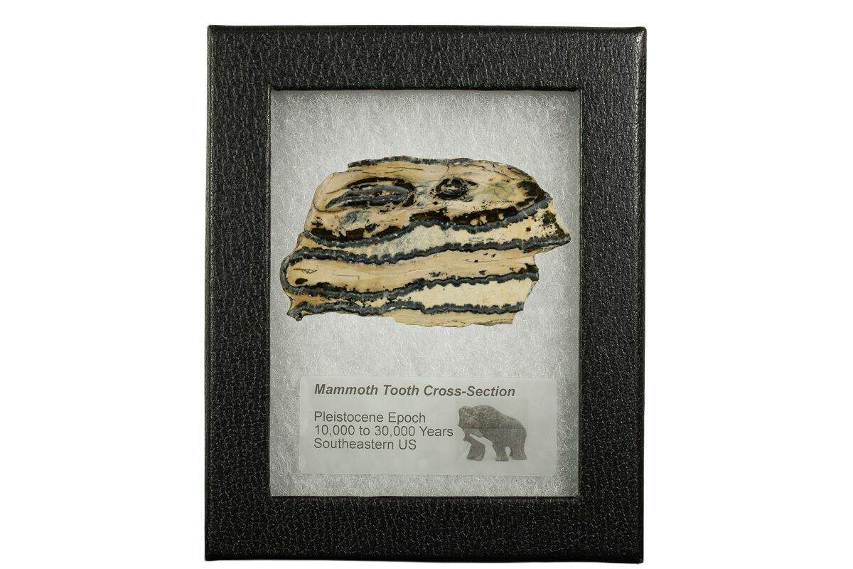 This is a interesting, cross-sectional slice of a Columbia Mammoth (Mammuthus columbi) molar collected from the coastal region of South Carolina. It comes with a riker mount display case.