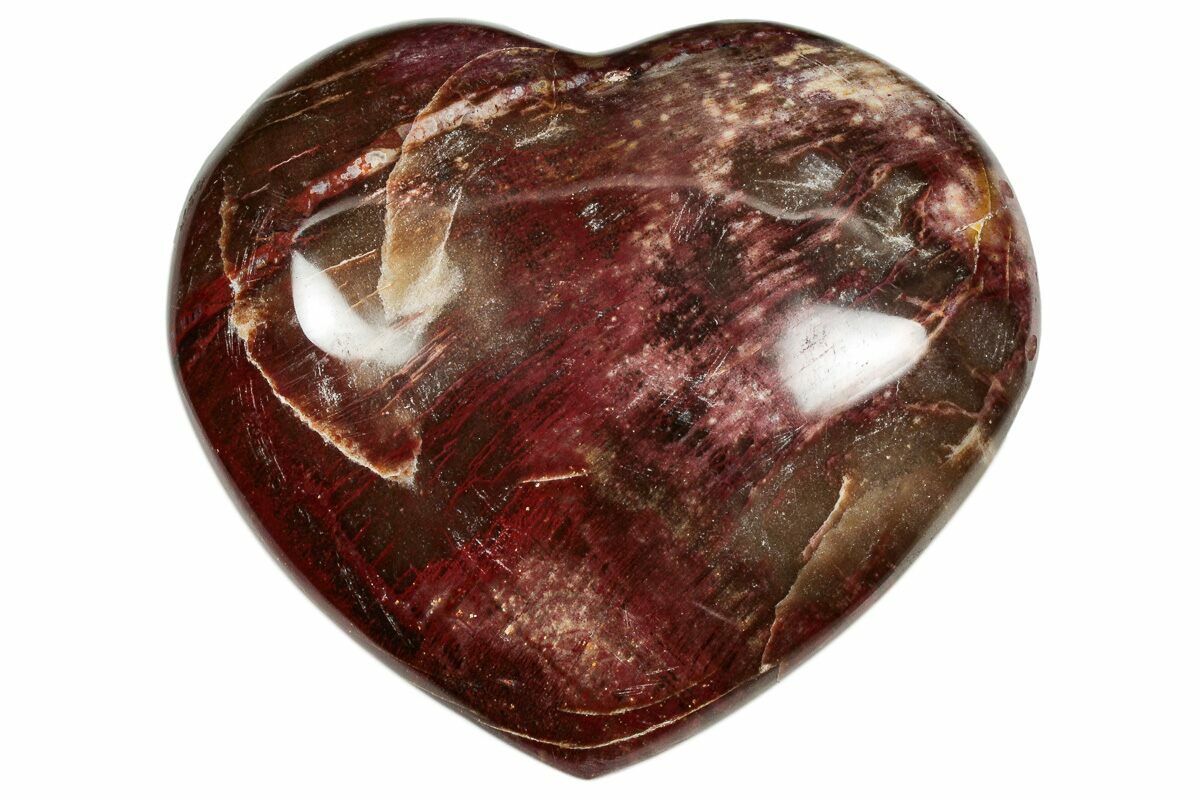 This is a 2.95" wide colorful polished petrified wood heart. It is from the Araucaria tree, a type of conifer. This petrified wood is early Triassic in age, or approximately 220 million years old, close to the time the first dinosaurs appeared on the planet. The wood was collected near Ambilobe, Madagascar.