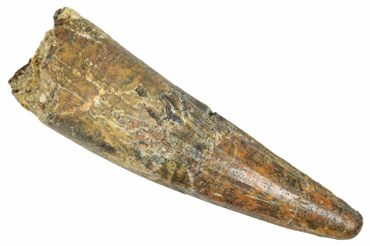 This is a 2.98" long Spinosaurus tooth from the Kem Kem Beds of Morocco. It is Late Cretaceous in age, approximately 95 million years old.
