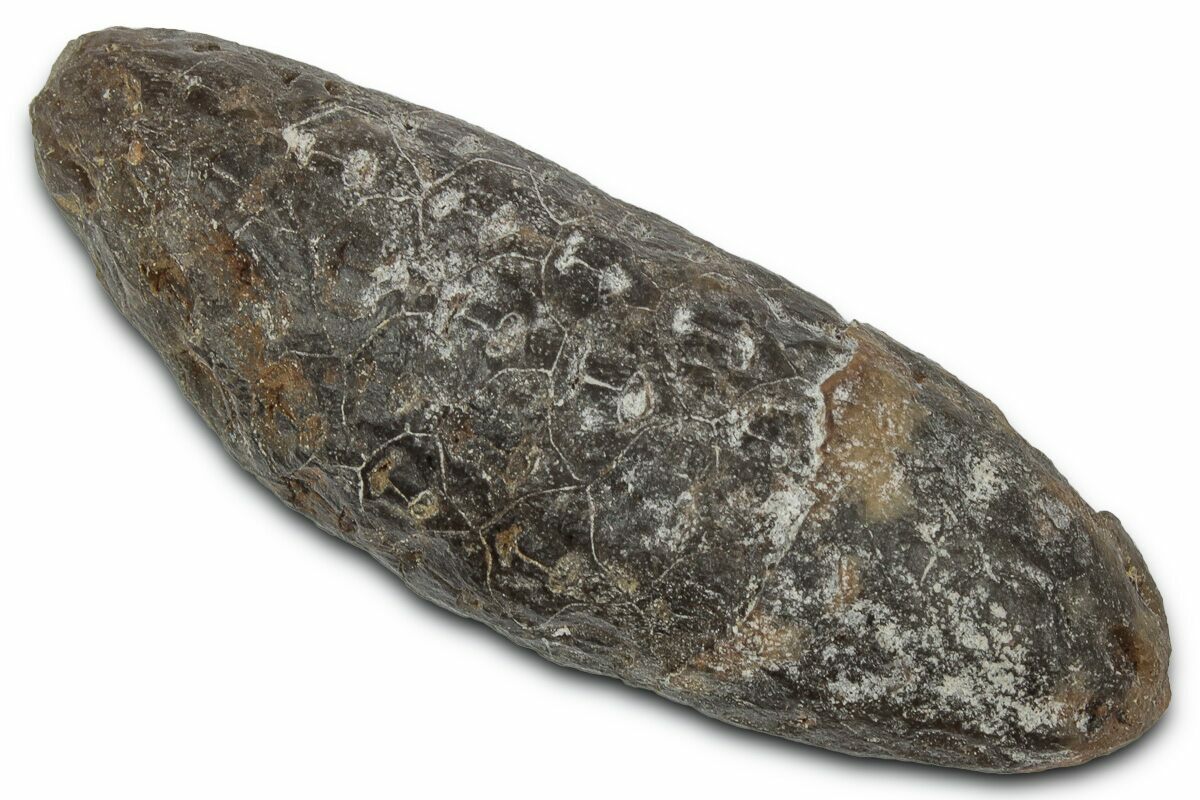 This is a 2" long fossil seed cone believed to be from a Cycadophyte plant. These cones are Late Eocene in age and are collected near Boujdour in the Sahara Desert of Morocco. This one has been sliced down the middle and polished to reveal it's inner details, including the cone’s chambered seed arrangement and vascular structure.