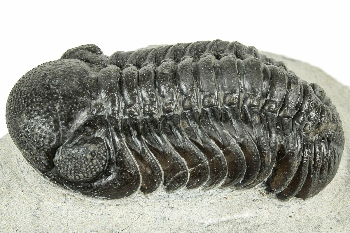 This is a detailed, 2" long Austerops trilobite from Ofaten, Morocco. The surrounding limestone has been meticulously removed so that it looks like it is ready to crawl off of the rock. There is good eye facet preservation in both eyes and it has no restoration.