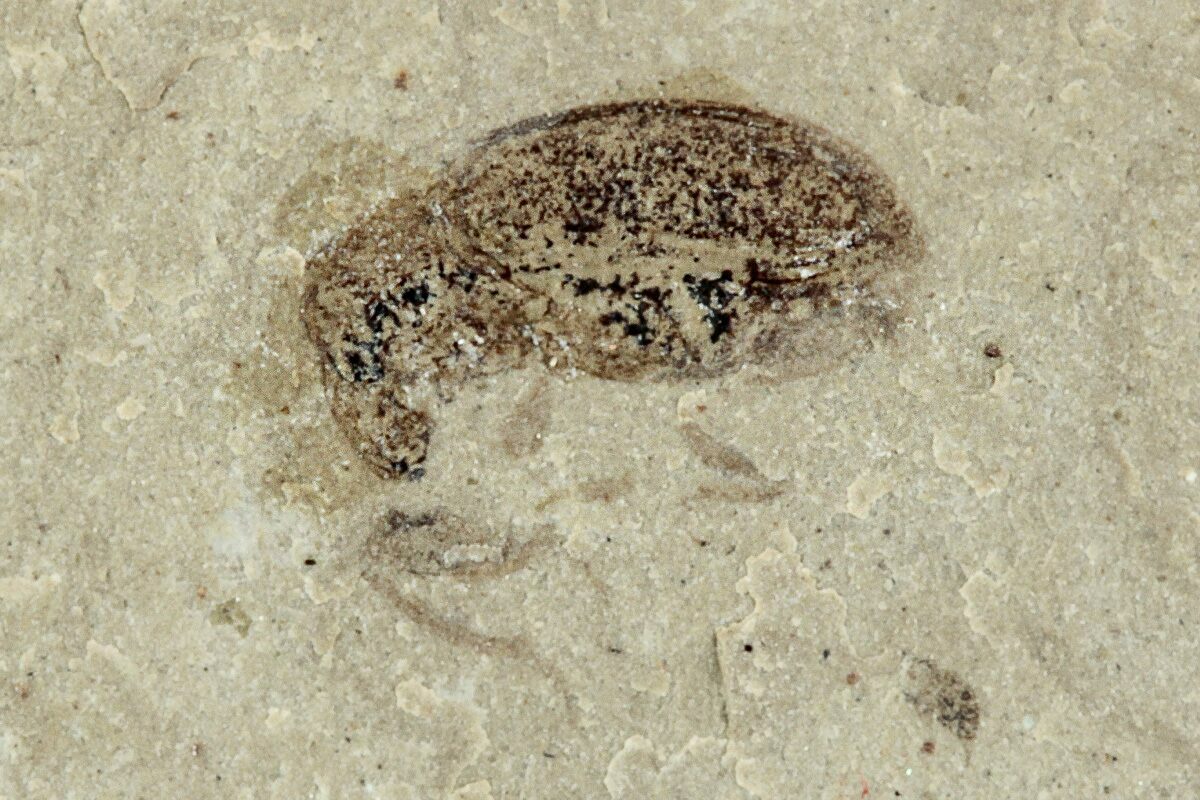 This is a detailed, .2" long fossil weevil (family Curculionidae) from the Green River Formation of Utah. While this formation is best known for well preserved fossil fish found in Wyoming, other sections of the formation contain a very diverse insect fauna.