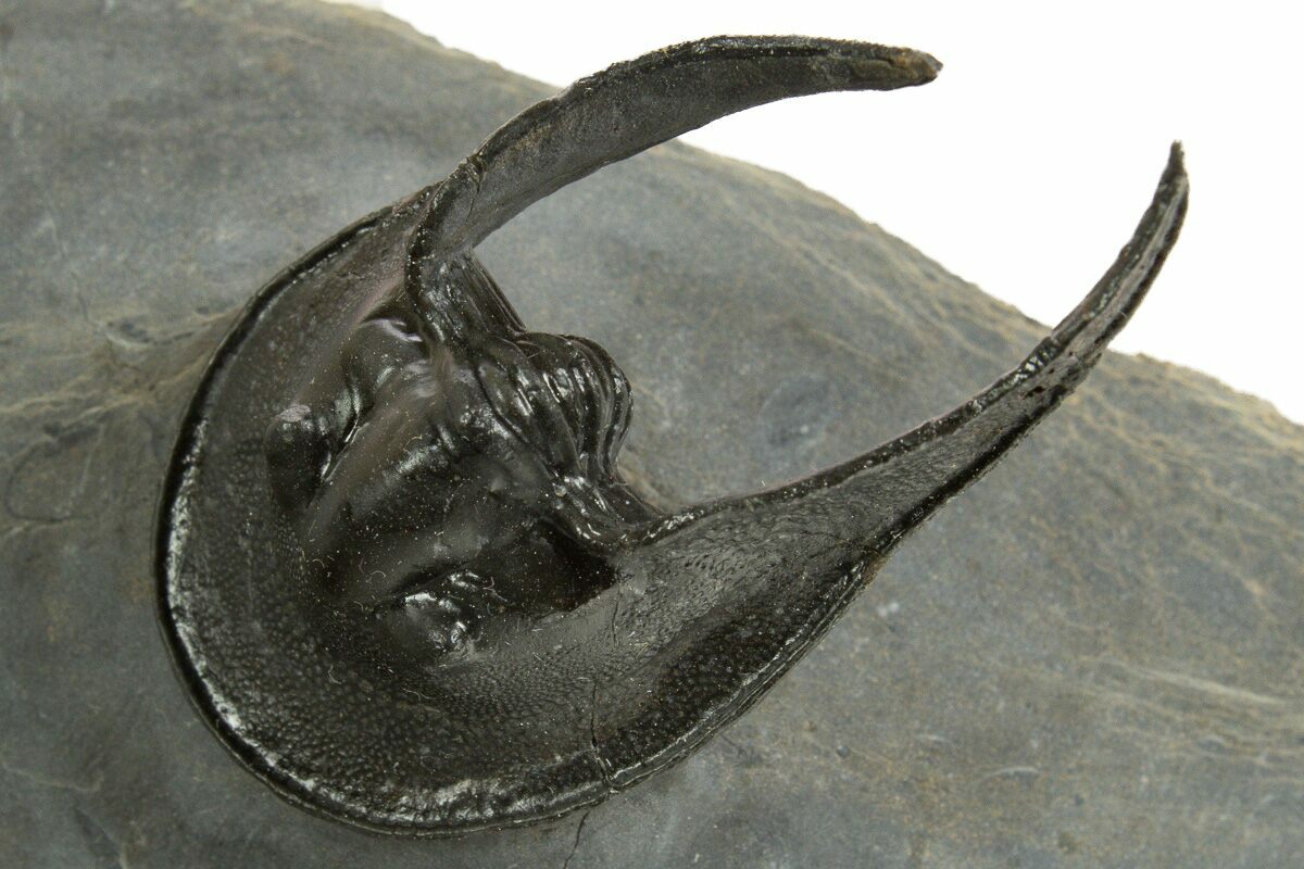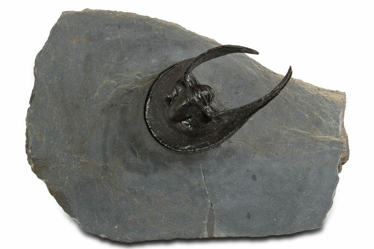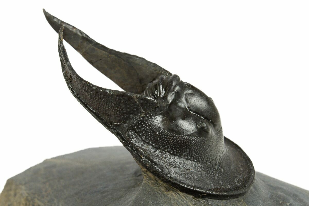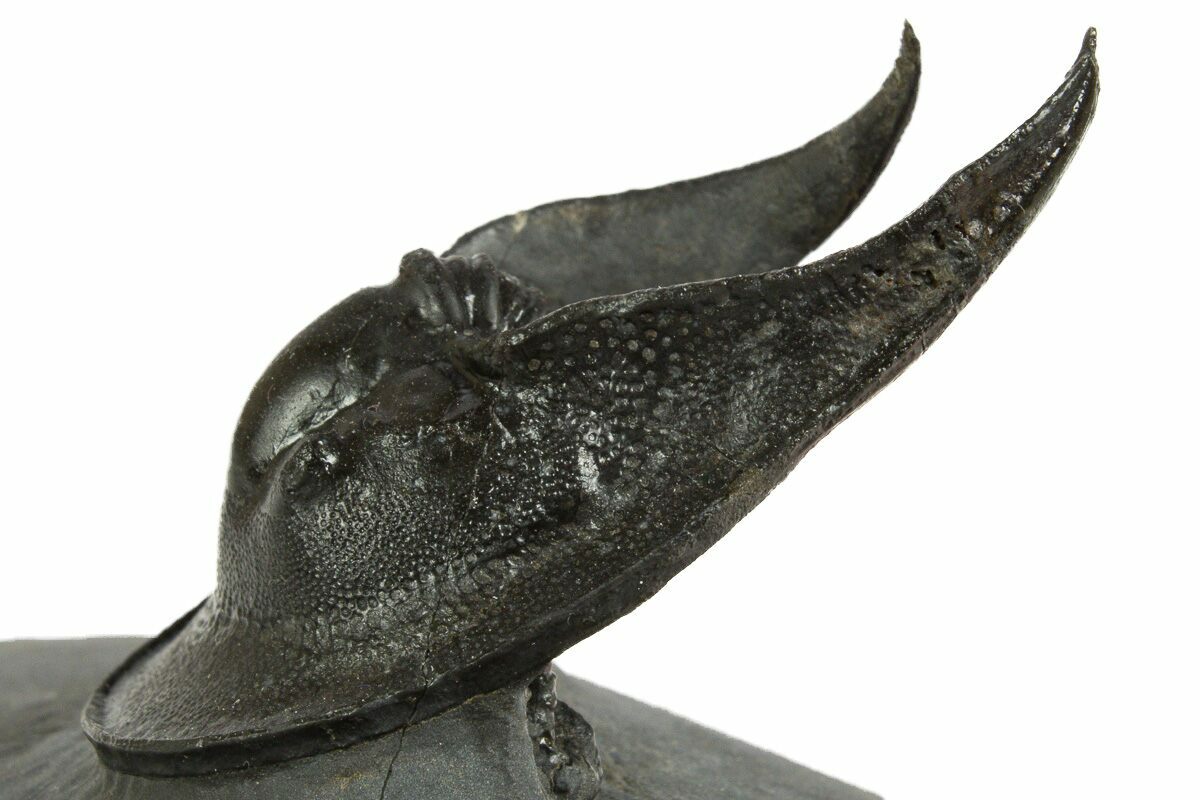 Here is a gorgeous, 2" long example of the Harpetid trilobite, Scotoharpes, collected from the Middle Devonian-aged El Otfal Formation in Morocco. It has a very dramatic "head shield" which is often interpreted as a mechanism to help it stay on top of a soft ocean floor. This preglabellar ring (head shield) is covered in many sensory pits which may have held hairlike features when the trilobite was alive.