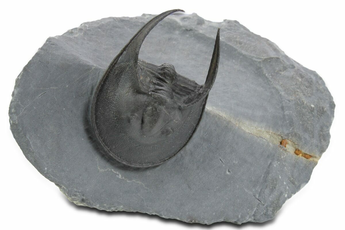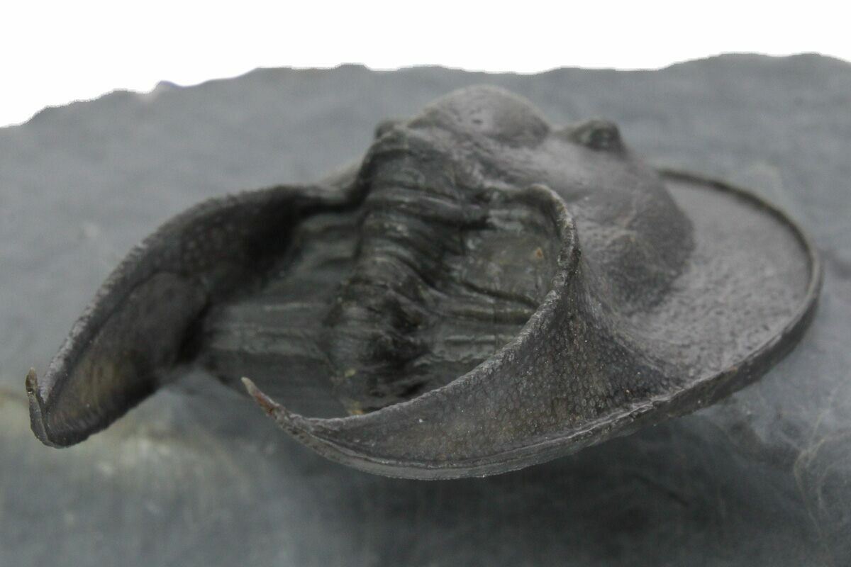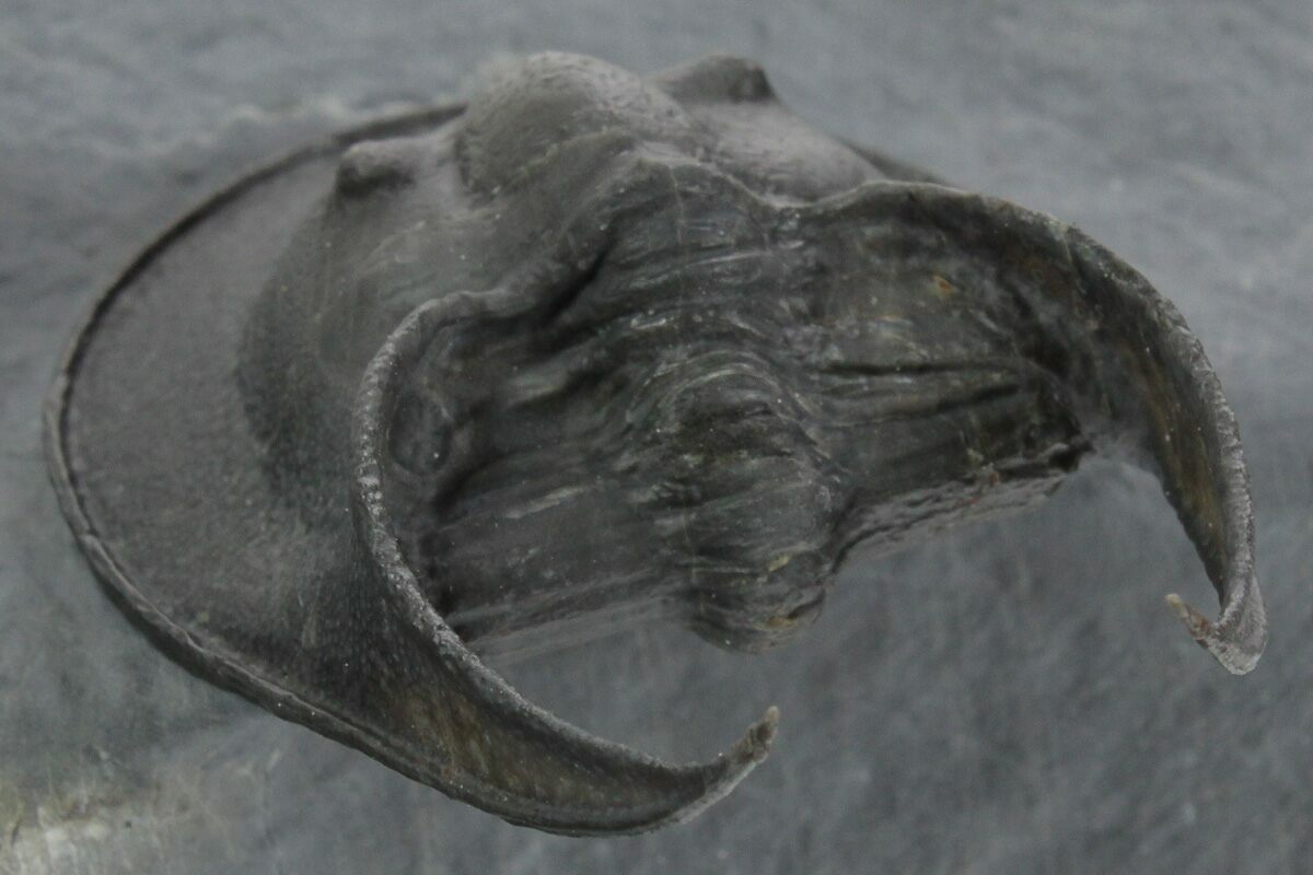 Here is a gorgeous, 2" long example of the Harpetid trilobite, Scotoharpes, collected from the Middle Devonian-aged El Otfal Formation in Morocco. It has a very dramatic "head shield" which is often interpreted as a mechanism to help it stay on top of a soft ocean floor. This preglabellar ring (head shield) is covered in many sensory pits which may have held hairlike features when the trilobite was alive.