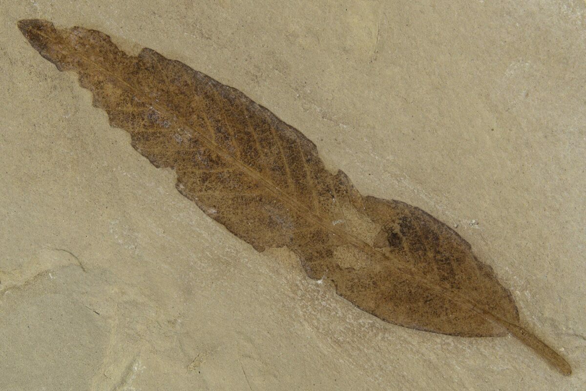 This is an Eocene aged fossil leaf of Cedrelospermum nervosum, an extinct species of plant classified within the Ulmaceae family, which includes modern trees like elm and hackberry. The leaf is 2" long and on a piece of shale. It is nicely preserved with crisp edges and brown coloration.
