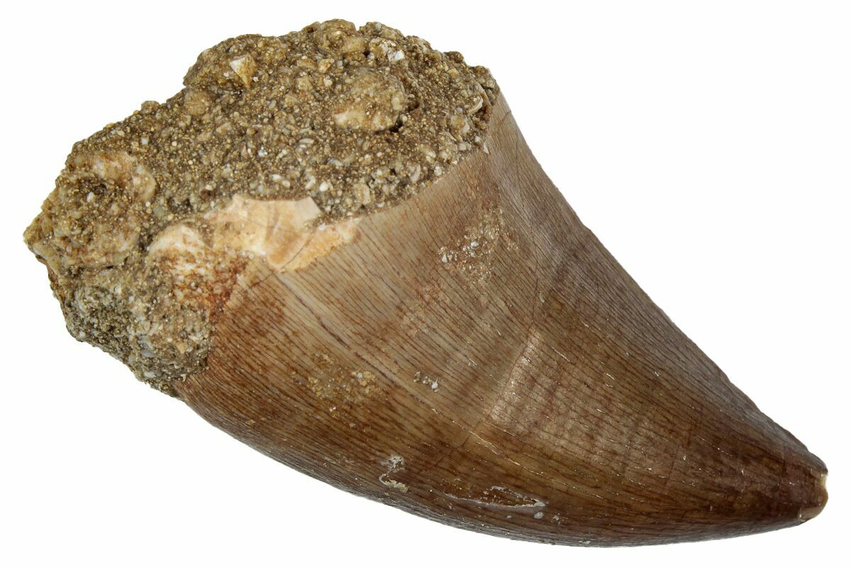 This is a 2" fossil mosasaur (Thalassotitan atrox) tooth from the Upper Cretaceous phosphate deposits in the Oulad Abdoun Basin of Morocco.