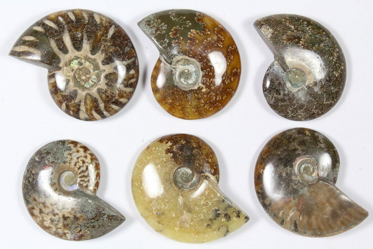 This is a wholesale bag of polished ammonite fossils from Madagascar. There is 1 kg (21 pieces) of ammonites ranging in size from 2-3" wide. There are several different species represented. These ammonites are Middle Cretaceous in age or approximately 110 million years old. The polishing reveals the beautiful suture pattern that would lie below the shell and is often used as a diagnostic feature in identifying different species of ammonites.