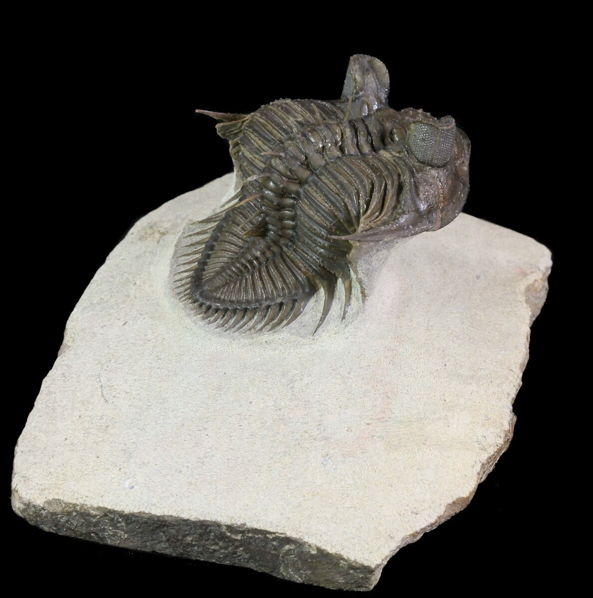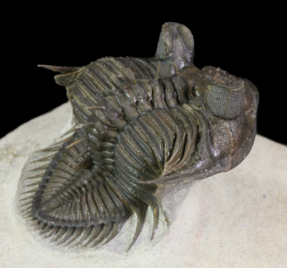 This an absolutely stunning specimen, rare, tower-eye, Erbenochile issoumourensis trilobite from Foum Zeguid, Morocco. It's preserved in a "climbing" position but would be about 2" long if outstretched. Excellent preservation with no major restoration.
