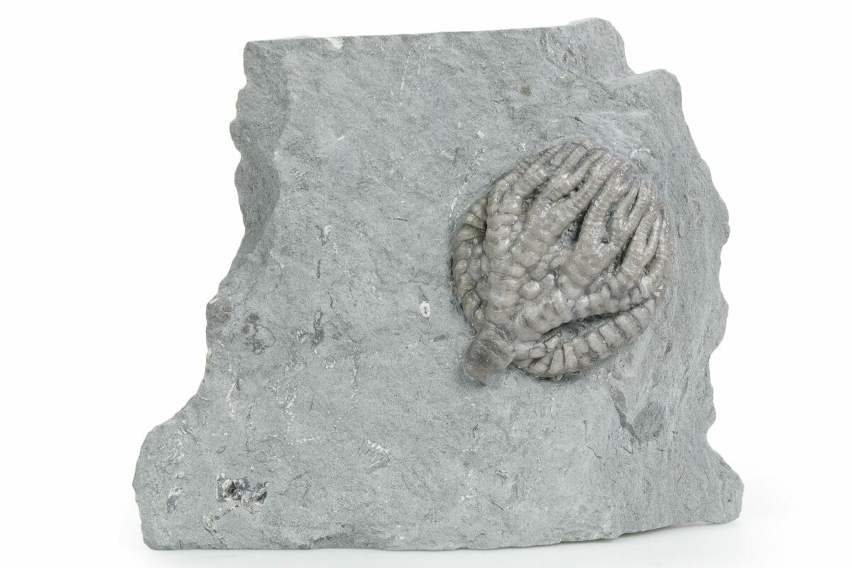 Crinoids from the Ramp Creek Limestone of Crawfordsville, Indiana are world-famous for their extraordinary preservation and diversity. During the Mississippian Period, sudden storm events likely swept fine sediment from nearby deltas across the seafloor, rapidly burying living crinoids where they stood. This quick entombment protected even the most delicate structures, resulting in soft siltstone that can be carefully prepared to reveal fossils in stunning, fully three-dimensional relief.
