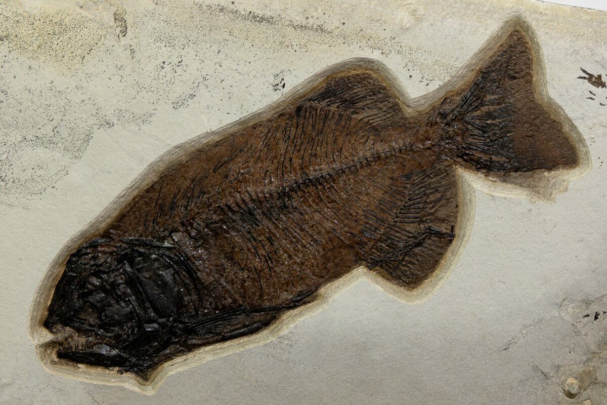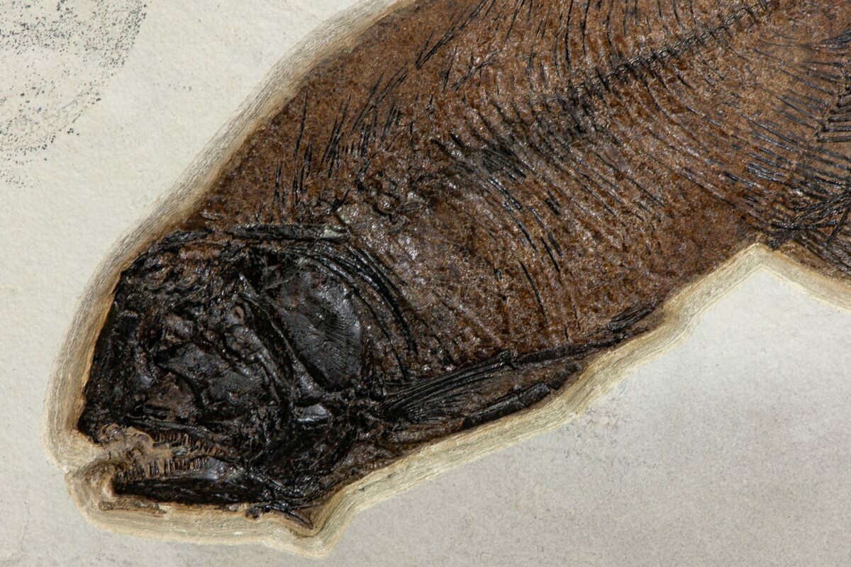 Specimens like this come from the coveted 18 inch layer of the Green River Formation, which produces darker and more detailed fish than the majority on the market. The rock from this layer is much harder and more durable than other layers in the formation, likely due to its initial deposition conditions in deep water. Because of these conditions, fish found in the 18-inch layer can be extracted whole and in excellent condition. This layer is typically collected at night using low-angle light to see the bump in the rock that the fish's backbone creates. They then cut these fish out and take them to a lab where the fish, which may be up to an inch under the surface of the rock, are meticulously extracted under microscope with hand tools.