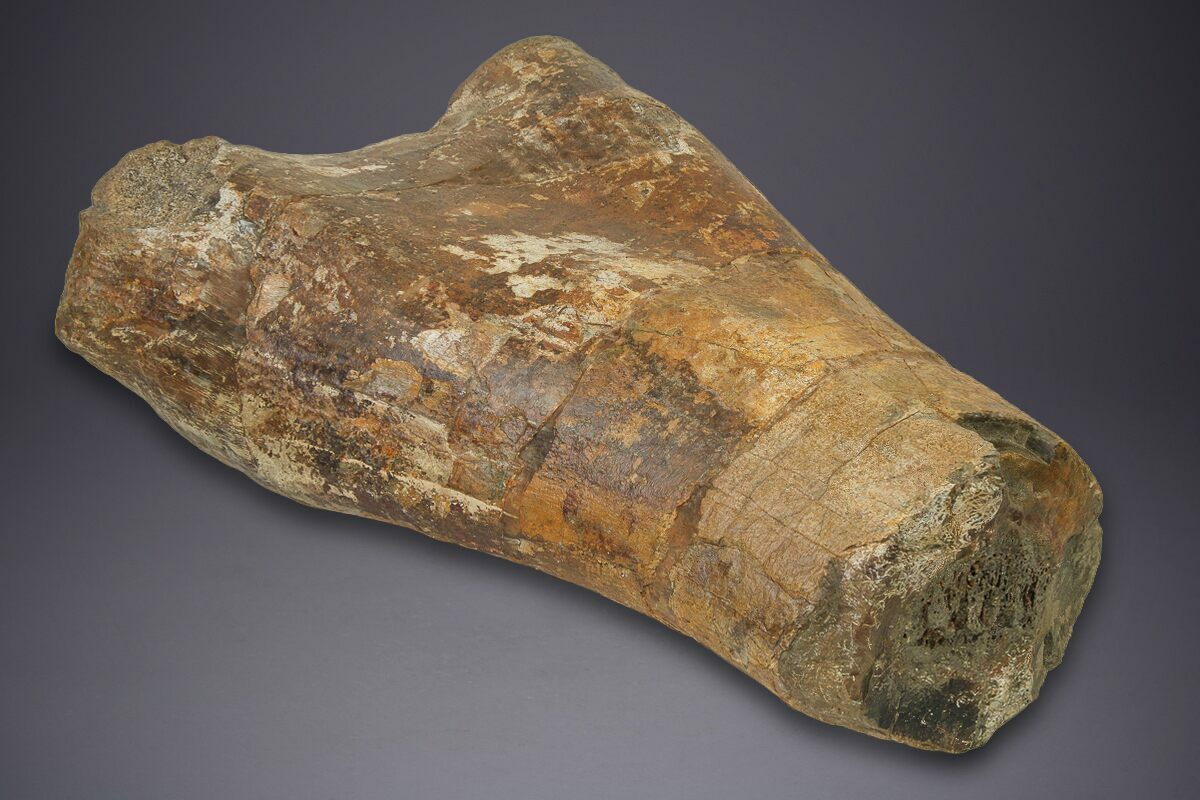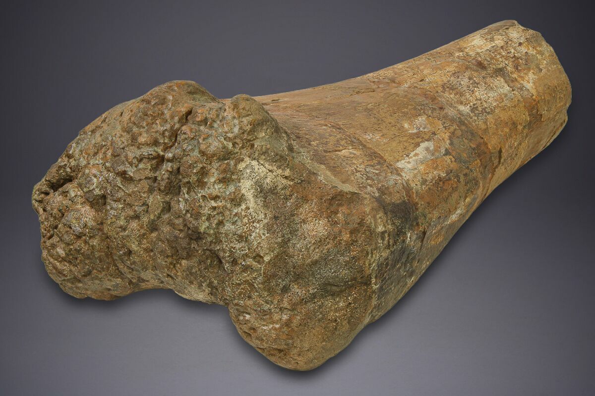 This substantial 20.5" fossil humerus, representing the proximal half of the right forelimb of a sauropod dinosaur (Camarasaurus sp.), was recovered from the Late Jurassic Morrison Formation of Colorado. The preserved portion is notably robust and well inflated, with dense silicification producing high-quality gembone. Exceptional preservation of the point of articulation and humeral head. Although only the proximal half of the element was salvaged, it powerfully conveys the mass and strength of the living animal.