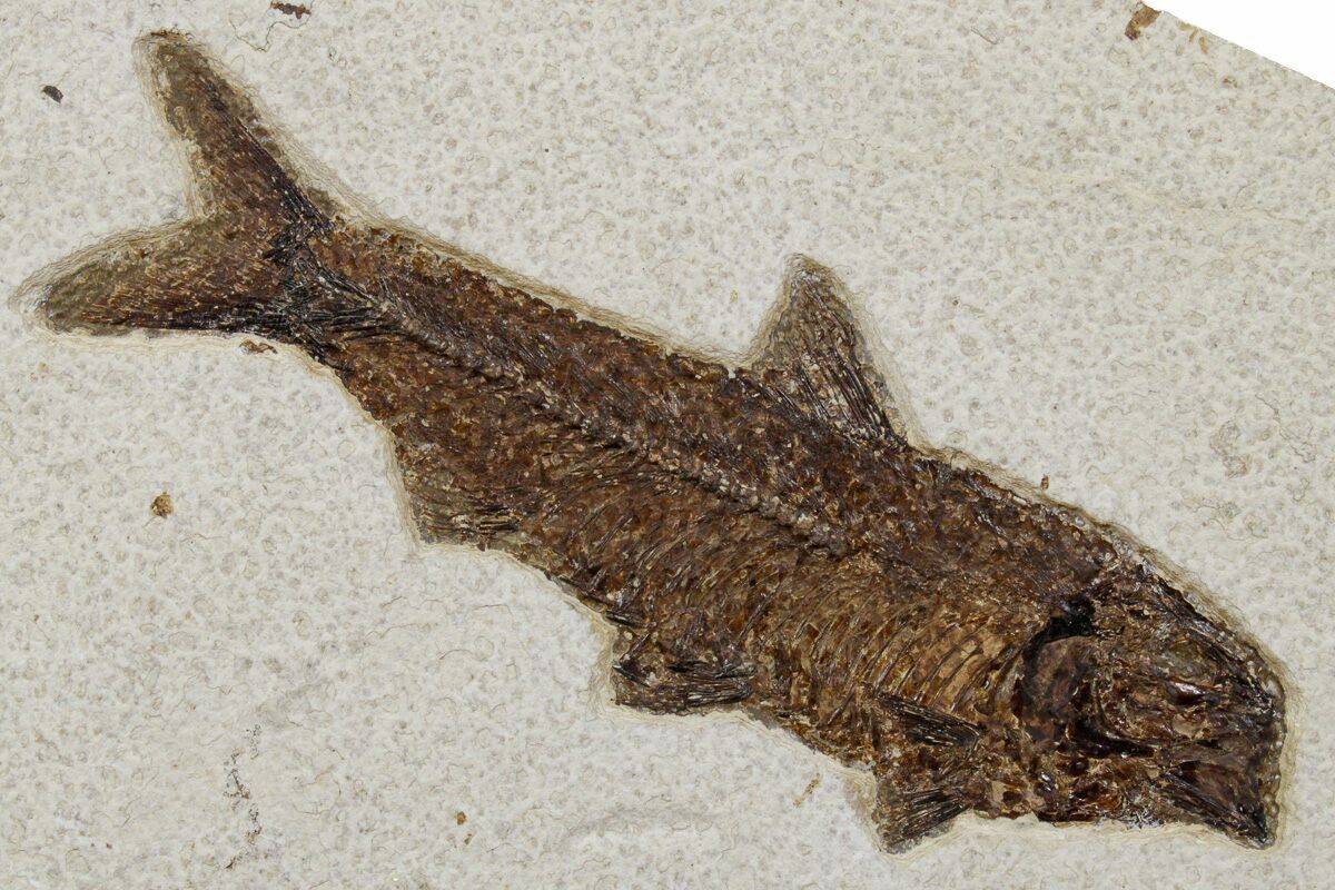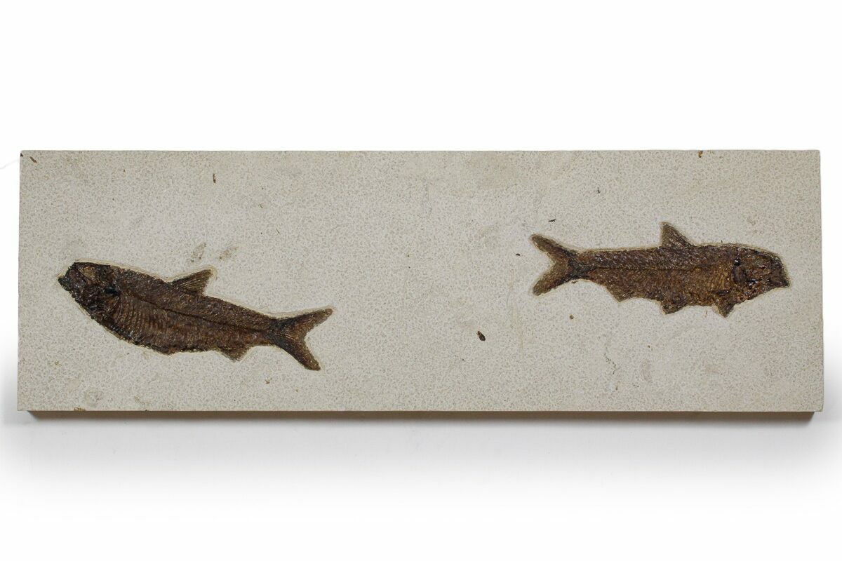 This limestone slab from the renowned 18" layer of the Green River Formation contains two beautifully preserved Knightia eocaena fossil fish from Eocene-aged Wyoming deposits. Both fish are exceptionally large for the species, with the largest fish measuring 7" long, and both show excellent detail, with bone structure, fins, and scale texture clearly visible.