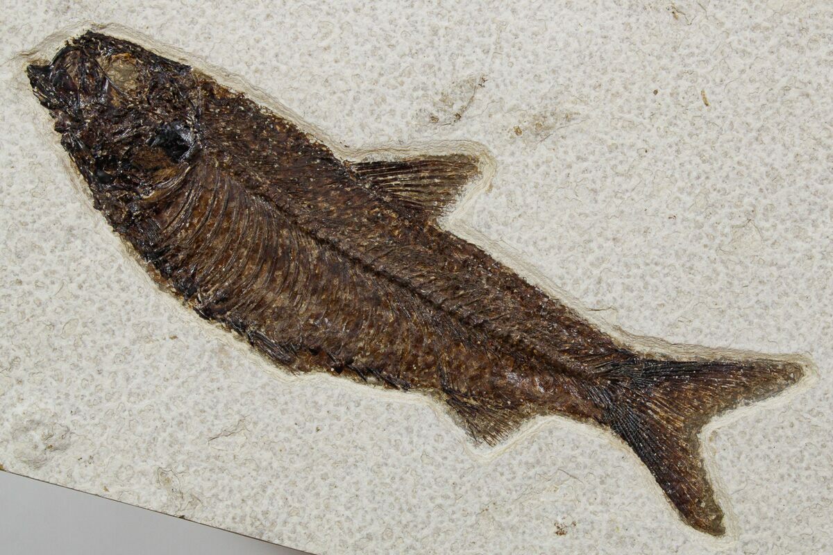 Specimens like this come from the coveted 18 inch layer of the Green River Formation, which produces darker and more detailed fish than the majority on the market. The rock from this layer is much harder and more durable than other layers in the formation, likely due to its initial deposition conditions in deep water. Because of these conditions, fish found in the 18-inch layer can be extracted whole and in excellent condition. This layer is typically collected at night using low-angle light to see the bump in the rock that the fish's backbone creates. They then cut these fish out and take them to a lab where the fish, which may be up to an inch under the surface of the rock, are meticulously extracted under microscope with hand tools.