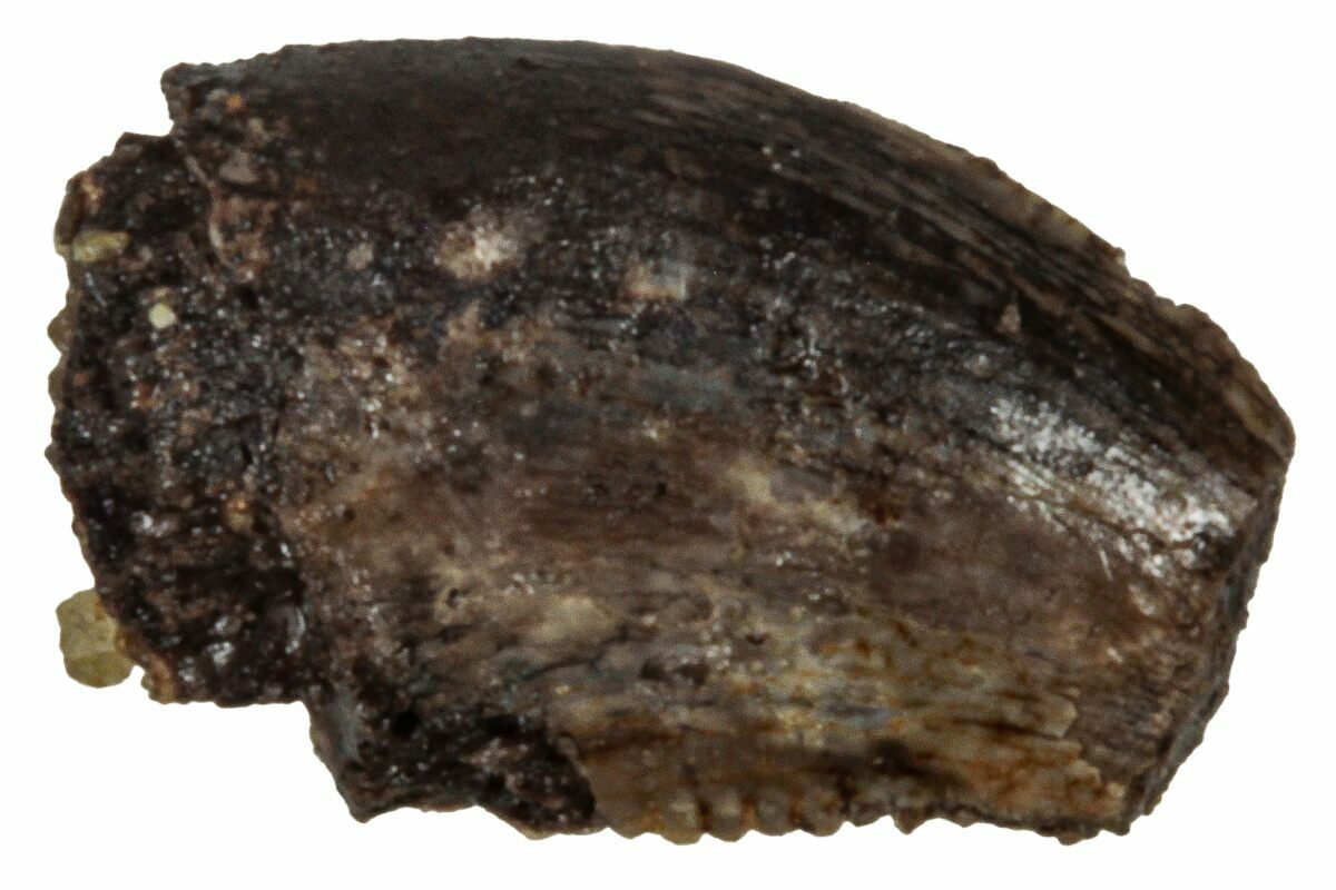 This is a serrated, .20" long, small theropod partial tooth from the Hell Creek Formation in Montana. Serrations can be found along both edges, though the enamel is mostly missing. The larger serrations along the distal edge in comparison to those along the mesial edge indicate that this very well could be from Acheroraptor temertyorum, though the lack of apicobasal ridges make it tough to tell for sure.