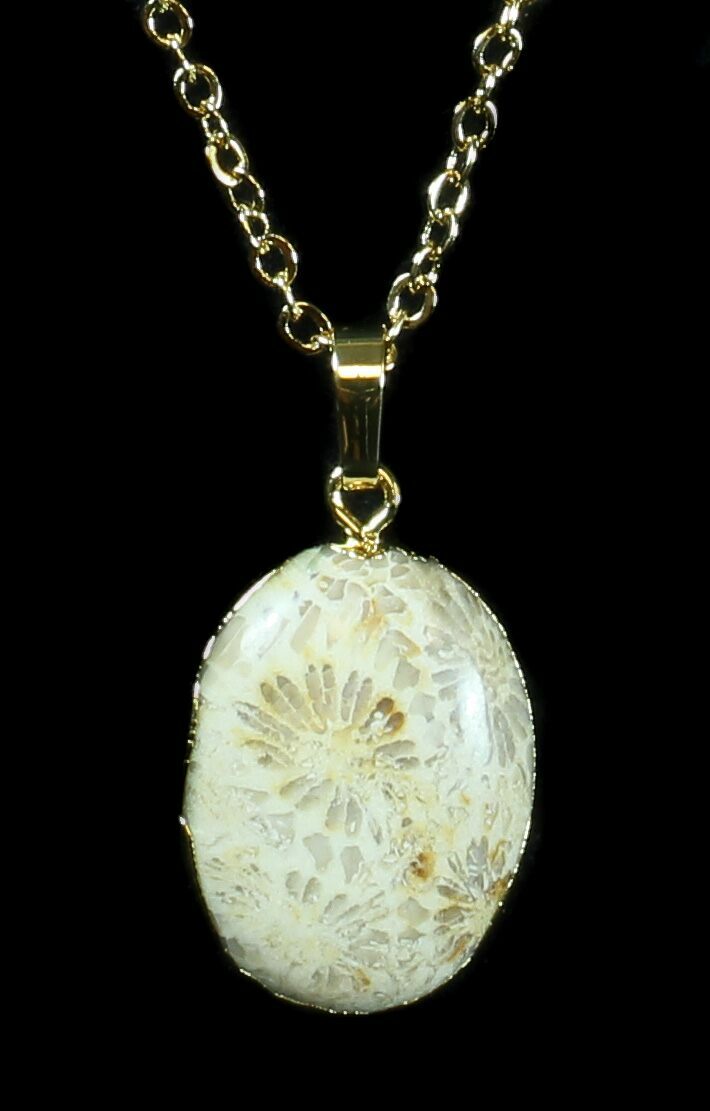 This is a pendant made from polisehd, fossil coral from Sumatra, Indonesia. The polishing allows the beautiful, fossilized structure of the coral heads to easily be seen. It includes a 19 inch gold colored metal chain.