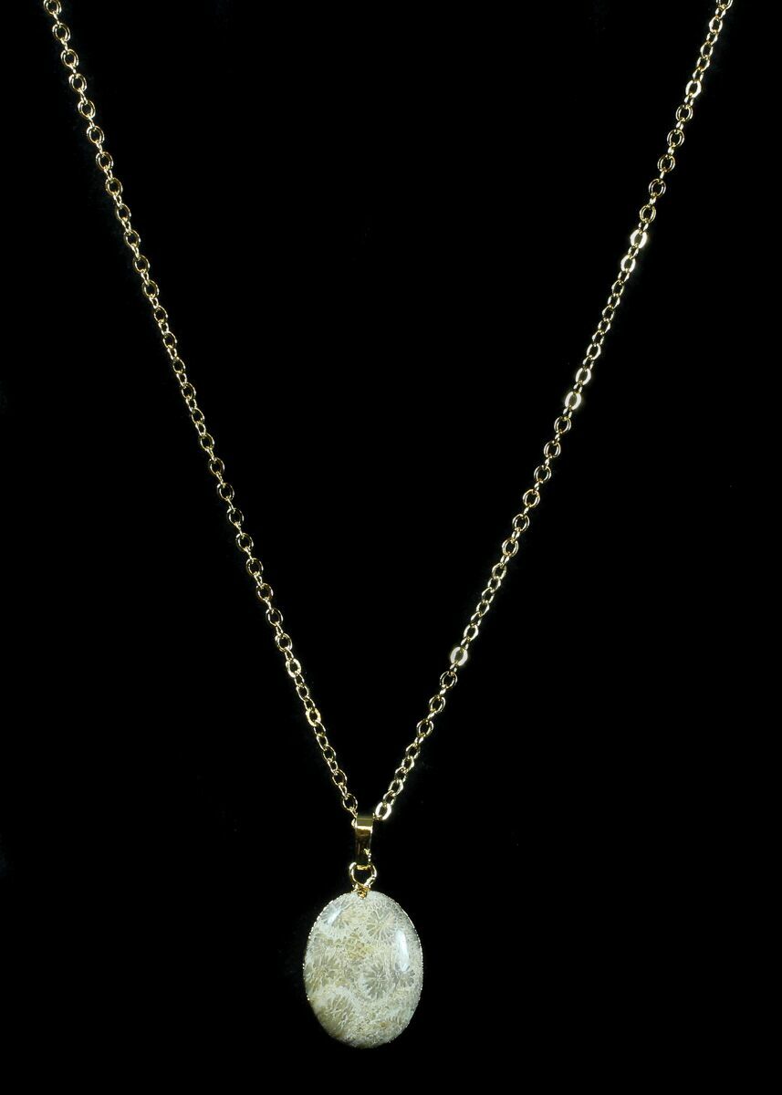 This is a pendant made from polisehd, fossil coral from Sumatra, Indonesia. The polishing allows the beautiful, fossilized structure of the coral heads to easily be seen. It includes a 19 inch gold colored metal chain.