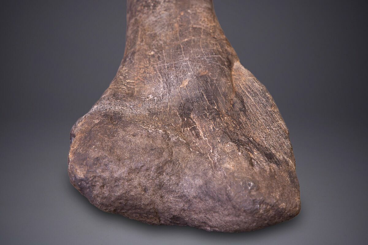 There are several repaired cracks through the diaphysis of this bone, with spots of gap fill restoration within some of the cracks near the middle. There is weathering to the proximal and distal epiphyses, with a section of restoration to the proximal end. The stand for this bone holds the bone anatomically upside down.