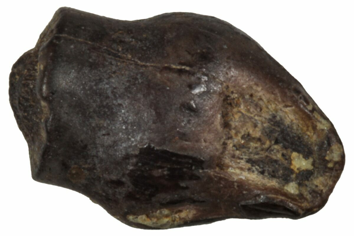 This is a .24" long tooth of the neornithischian dinosaur, Thescelosaurus garbanii. It was collected from the Late Cretaceous-aged Hell Creek Formation in Montana.