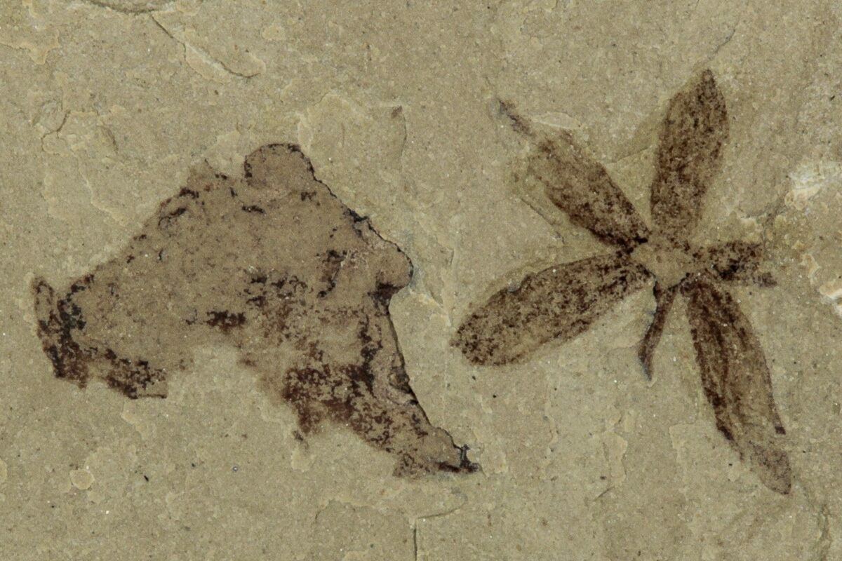 This is a well preserved .25" wide fossil flower from the Green River Formation, Uintah County, Utah. While this formation is best known for well preserved fossil fish found in Wyoming, other sections of the formation contain a very diverse flora and insect fauna.