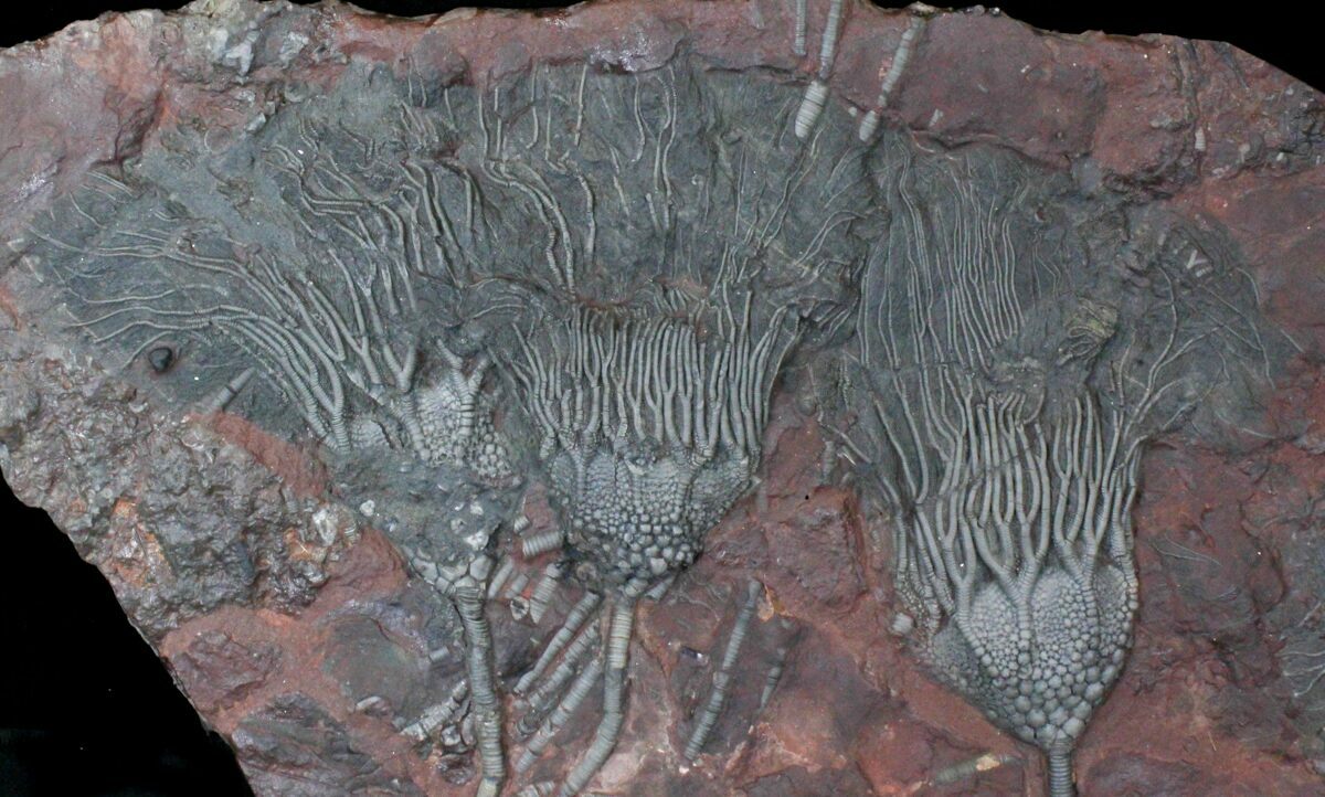 Crinoids where animals which were rooted to the floor of the ocean by a stem and had many armored feeding arms which they used to filter the water for food. They first appeared in the Ordovician period and are still alive today.